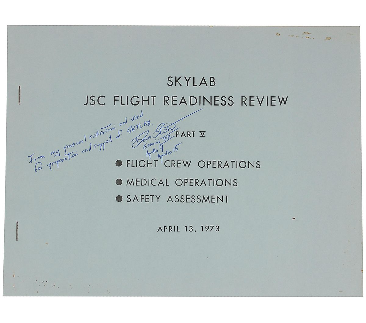 Dave Scott’s Skylab JSC Flight Readiness Review Part V, dated April 13, 1973, 10 x 8.5, 83 pages, bound by two staples to the left edge. Review covers flight crew operations, medical operations, and safety. Signed on the front cover in blue ballpoint, “From my personal collection and used for preparation and support of Skylab. Dave Scott, Gemini VIII, Apollo 9, Apollo 15.” In fine condition, with some scattered light soiling to cover.