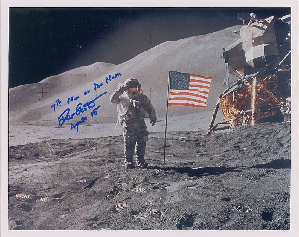 Color satin-finish 10 x 8 photo of Scott saluting the American flag on the lunar surface, signed in blue felt tip, “7th Man on the Moon, Dave Scott, Apollo 15.” In very fine condition.