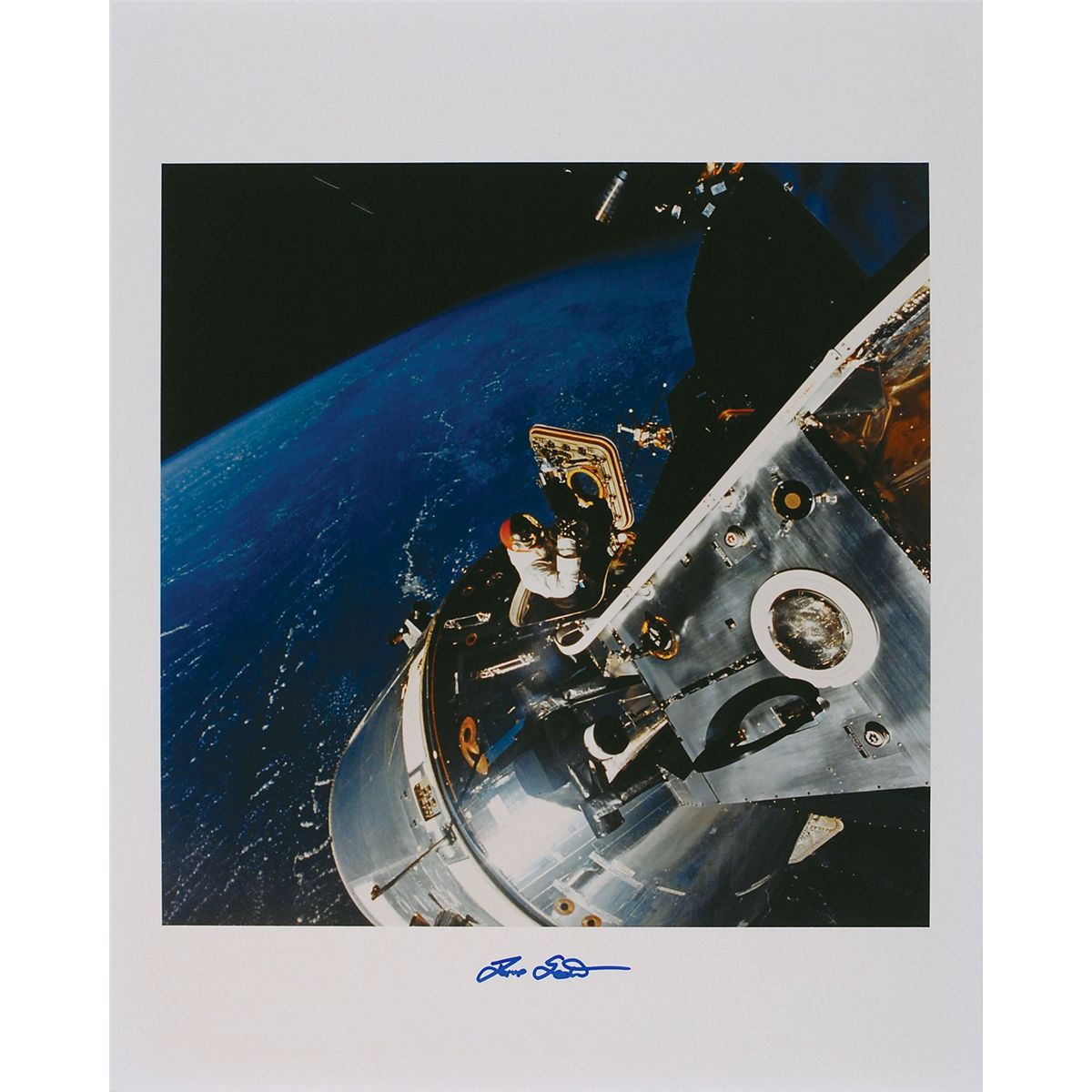 Color satin-finish 16 x 20 photo of Scott filming from the Apollo 9 command module hatch during the mission, signed in the lower border in blue felt tip. In fine condition, with a couple scattered light bends and creases.