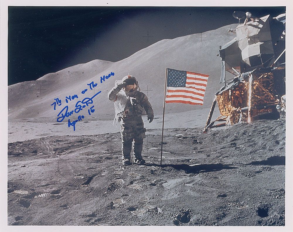 Color satin-finish 10 x 8 photo of Scott saluting the flag on the lunar surface, signed in blue felt tip, “7th man on the moon, Dave Scott Apollo 15.” In very fine condition.