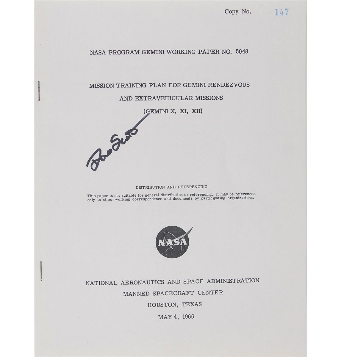 NASA mission training plan “for Gemini Rendezvous and Extravehicular Missions (Gemini X, XI, XII),” copy No. 147, bound by two staples along the left edge, 8.5 x 11, issued on May 4, 1966, signed on the front cover in black felt tip by Scott. In fine condition.
