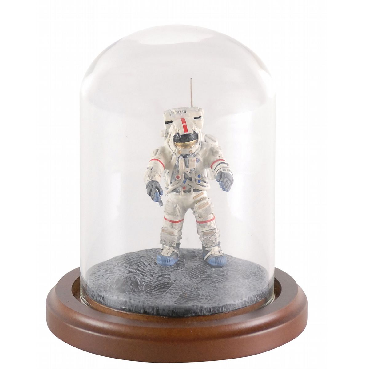 Detailed astronaut model, measuring approximately 2.5? tall, of Dave Scott dropping a feather and a hammer at the same time to demonstrate Galileo's theory that all objects fall at the same rate. Figurine is attractively presented atop a wooden base with a glass dome cover. Figurine is detached from the wooden base, though easily re-adherable, and the feather and shovel are present but not attached. In fine condition.