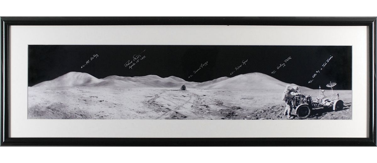Exceptional satin-finish 31.5 x 7.25 panoramic photo of the lunar surface after the Apollo 15 landing, signed in silver ink, “Dave Scott, Apollo 15 CDR,” adding labels of “Mt. Hadley,” “Swann Range,” “Silver Spur,” “Hadley Delta,” and “LRV #1 & Jim Irwin.” Matted and framed to an overall size of 37 x 13. In fine condition.