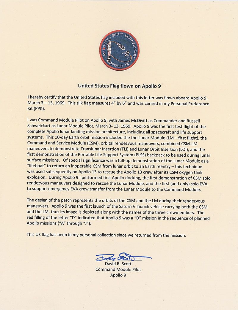 Flown printed fabric American flag, 6 x 4, flown on board Apollo 9, signed on a white stripe in blue ballpoint, “Flown aboard Apollo 9, March 3-13, 1969, Dave Scott, CDR.” Accompanied by a letter of authenticity from Dave Scott stating, in part, “I hereby certify that the United States flag included with this letter was flown aboard Apollo 9, March 3-13, 1969…and was carried in my Personal Preference Kit (PPK)…This US flag has been in my personal collection since we returned from the mission.” In fine condition.
