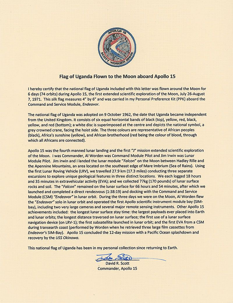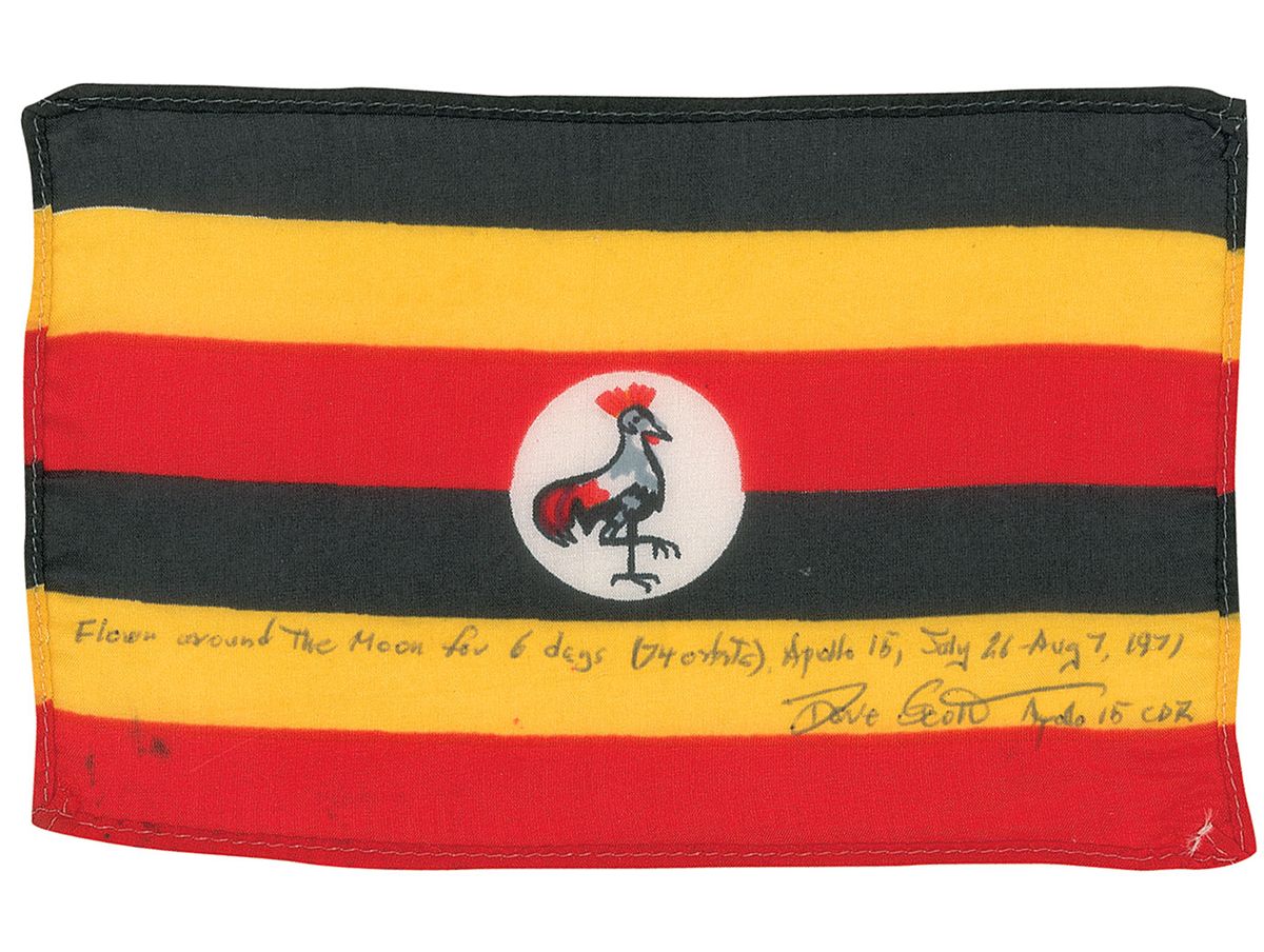 Flown Ugandan flag, 6 x 4, flown to lunar orbit aboard Apollo 15, signed in blue ink on a yellow panel, “Flown around the Moon for 6 days (74 orbits), Apollo 15, July 26–Aug 7, ’71, Dave Scott, Apollo 15 CDR.” Accompanied by a letter of authenticity from Scott which reads, in part: “I hereby certify that the national flag of Uganda included with this letter was flown around the moon for 6 days (74 orbits) during Apollo 15…July 26-August 7, 1971…and was carried in my Personal Preference Kit (PPK) aboard the Command and Service Module, Endeavor…This national flag of Uganda has been in my personal collection since returning to Earth.” In fine condition.