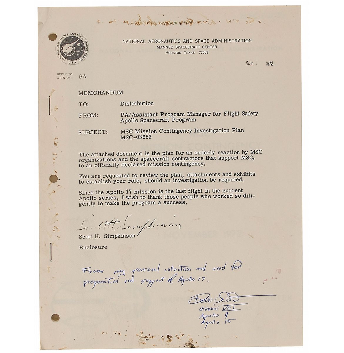 Dave Scott’s NASA Mission Contingency Investigation Plan memo, stamp-dated November 1972, 8 x 10.5, 27 pages, bound with two staples along the left edge. Cover sheet states that the plan is “for an orderly reaction by MSC organizations and the spacecraft contractors that support MSC, to an officially declared mission contingency.” Signed on the front cover in blue ballpoint, “From my personal collection and used for preparation and support of Apollo 17. Dave Scott, Gemini VIII, Apollo 9, Apollo 15.” Scattered staining to cover, otherwise fine condition.