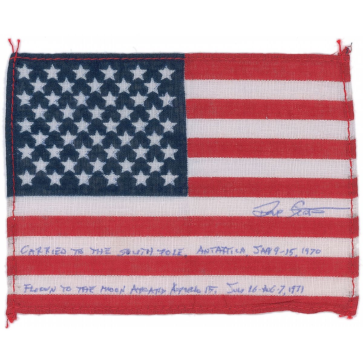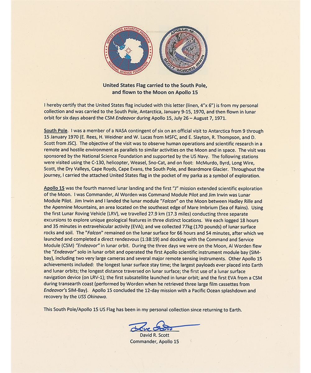 Flown American flag, 5.5 x 4, carried to the South Pole in 1970, and flown to lunar orbit during the Apollo 15 mission. Flag is signed on three white stripes in blue ink, “Dave Scott, carried to South Pole, Antarctica, Jan 9–15, 1970. Flown to the moon aboard Apollo 15, July 26–Aug 7, 1971.” Accompanied by a letter of authenticity from Dave Scott stating, in part, “I hereby certify that the United States flag included with this letter…is from my personal collection and was carried to the South Pole, Antarctica…and then flown in lunar orbit for six days aboard the CSM Endeavour during Apollo 15…I was a member of the NASA contingent of six on an official visit to Antarctica from 9 through 15 January 1970…Throughout the journey, I carried the attached United States flag in the pocket of my parka as a symbol of exploration…This South Pole/Apollo 15 US flag has been in my personal collection since returning to Earth.” In fine condition. Flags carried on any Apollo mission are highly desirable, with this particular flag making an extra trip to the bottom of the world.