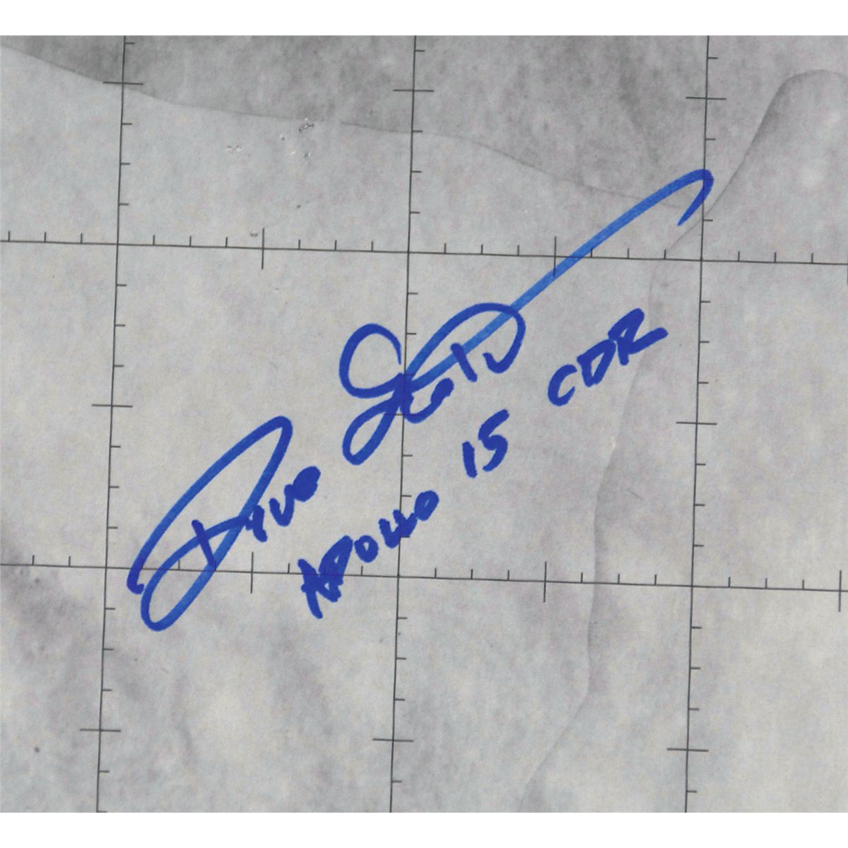 Enormous official NASA first edition lunar map, 58.5 x 41.25, labeled in a box in the lower right, “Lunar Uncontrolled Photomap, Rima Hadley, 1st Edition November 1971, Scale 1:25,000,” signed in blue felt tip, “Dave Scott, Apollo 15 CDR.” Rolled and in fine condition. This was one of the largest maps made during the Apollo program and shows the two large mountains of Hadley Delta and Mount Hadley, and the long valley of Rima Hadley. This was the area of the Apollo 15 LM landing site, ALSEP experiment site, and the crew’s excursions on the lunar rover.