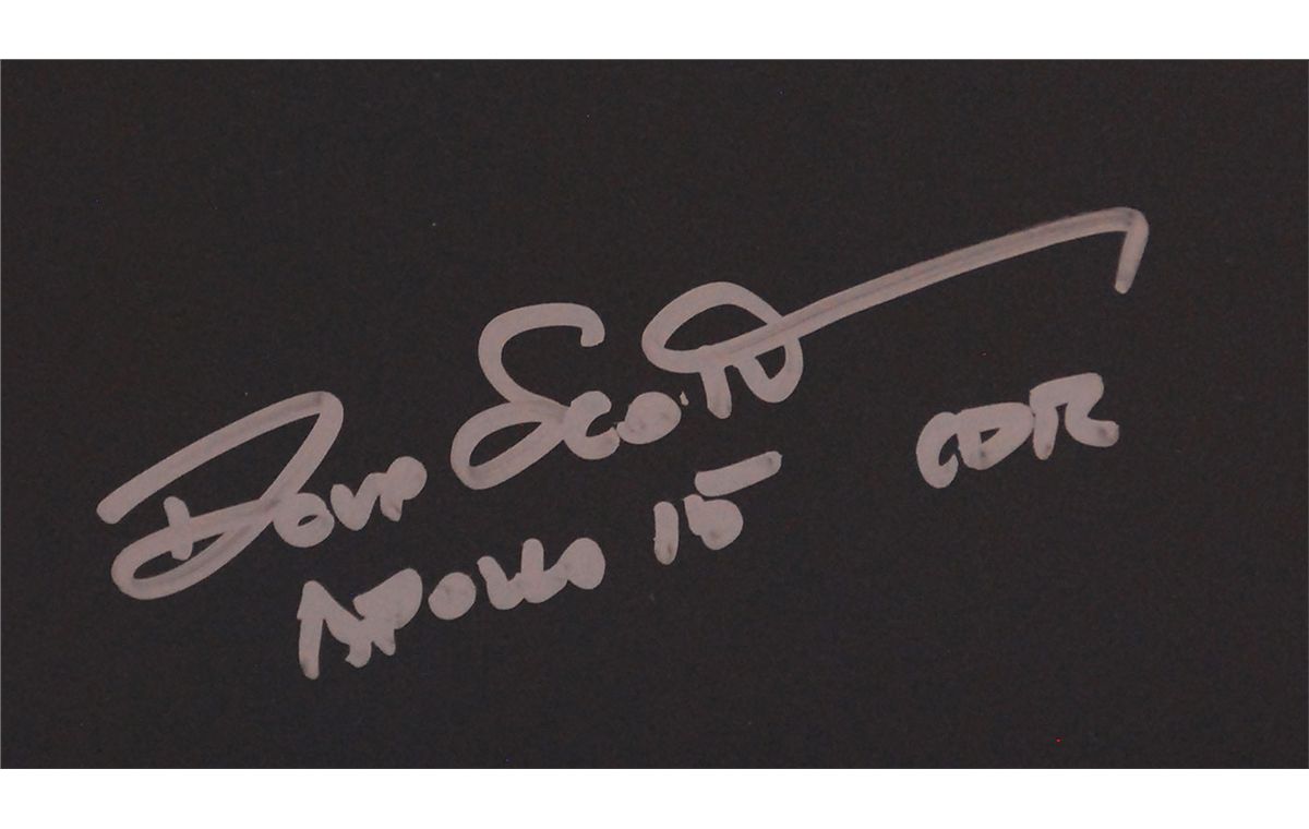 Satin-finish 40.5 x 8.5 panoramic photo of Scott examining a boulder on Hadley Delta during his mission, signed in silver ink, “Dave Scott, Apollo 15 CDR.” In very fine condition. Rolled.