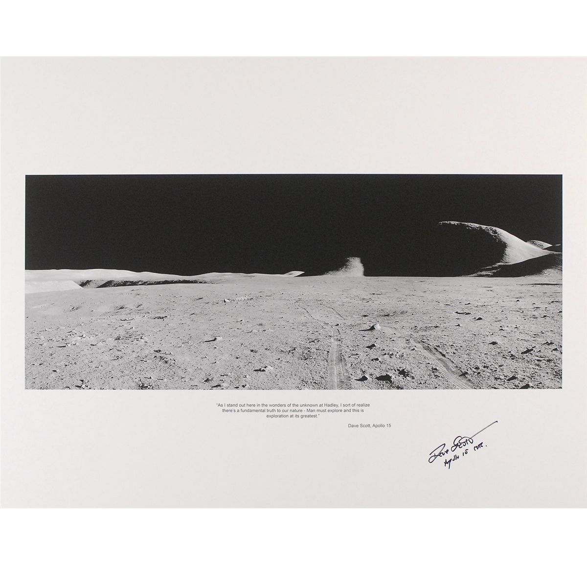 Very nice print, 22 x 17, of the tire tracks of the lunar rover on the moon’s surface, and featuring a printed quote from Scott, which reads, “As I stand out here in the wonders of the unknown at Hadley, I sort of realize there’s a fundamental truth to our nature—Man must explore and this is exploration at its greatest.” Signed in the lower border in black felt tip, “Dave Scott, Apollo 15 CDR.” In fine condition.