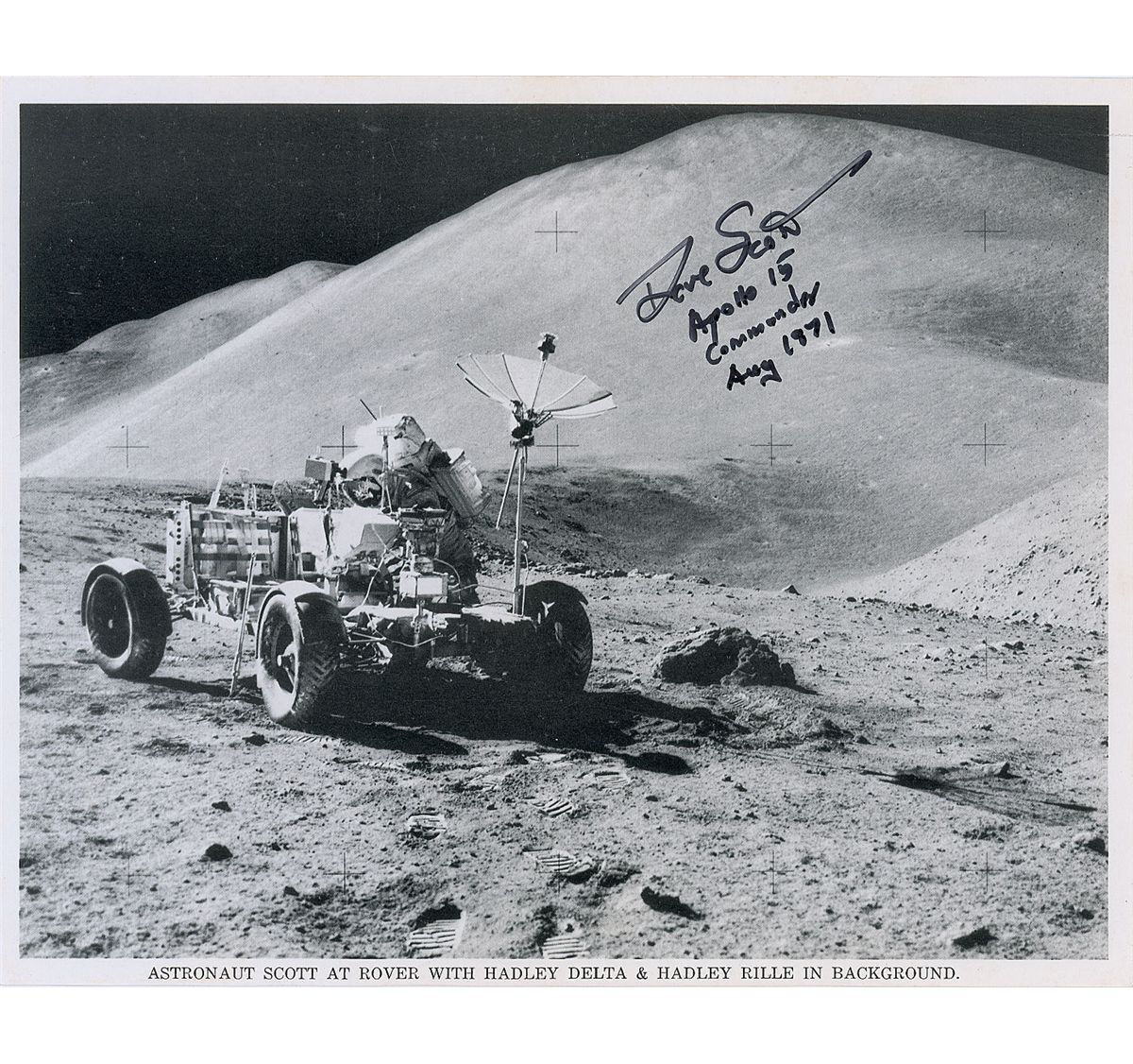 Official 10 x 8 NASA lithograph showing Scott with the Lunar Rover in the Hadley Delta area of the lunar surface, signed in black felt tip, “Dave Scott, Apollo 15, Commander, Aug 1971.” In fine condition.