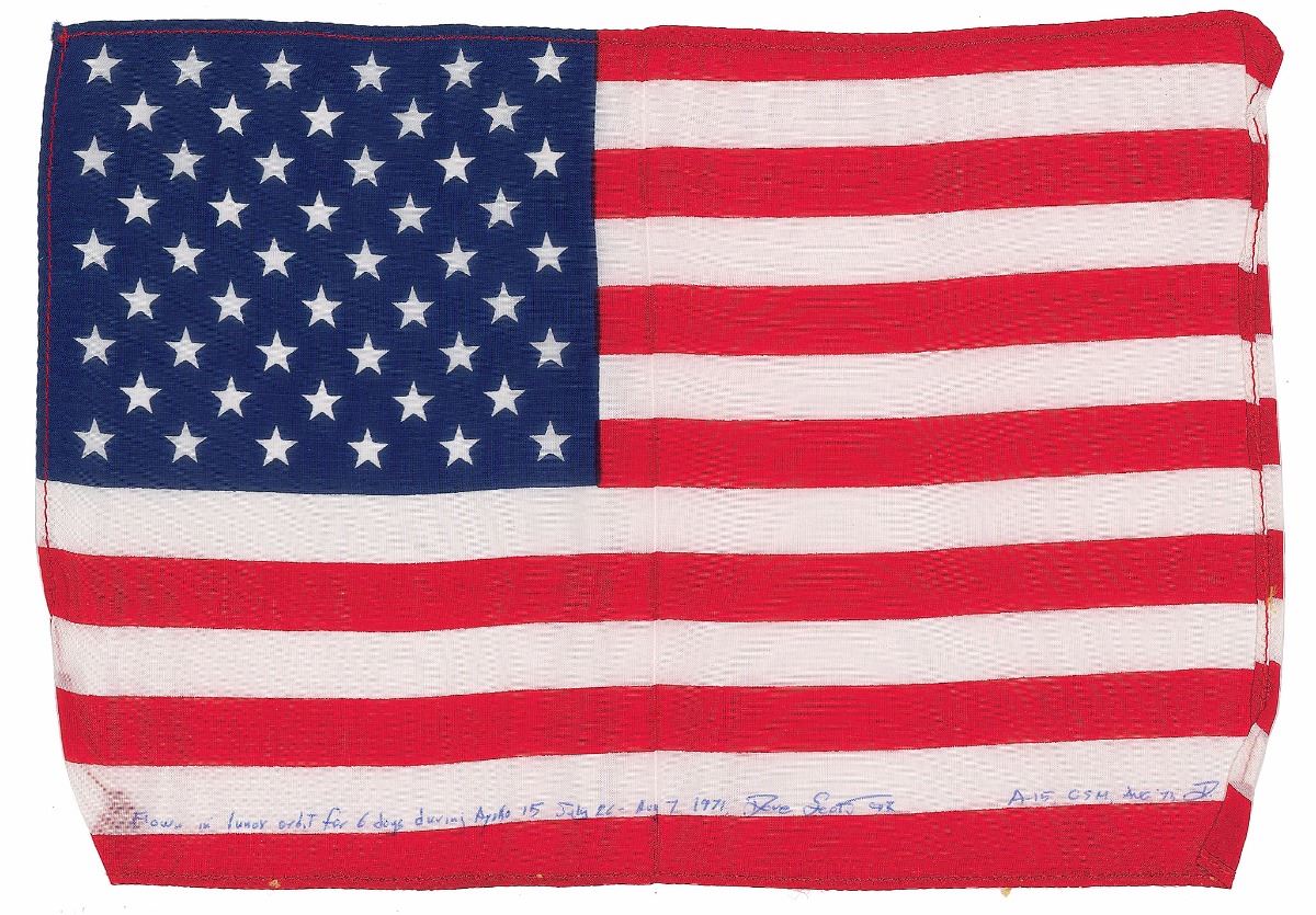 Supremely desirable flown American flag, 11.5 x 7.75, signed and flight-certified in blue ballpoint by Commander Dave Scott, “Flown in Lunar Orbit for 6 Days aboard Apollo 15, Dave Scott, CDR,” and signed again with his first initial to the right, “A-15. CSM. Aug ’71, D.” In fine condition. Accompanied by a signed letter of provenance from Scott, in part: “I hereby certify that the medium United States flag included with this letter…is from my personal collection and was flown in lunar orbit for six days aboard the CSM Endeavor during Apollo 15, July 26–August 7, 1971…After orbiting the Moon for a day in preparation for the landing, Jim Irwin and I landed the lunar module ‘Falcon’ on the Moon between Hadley Rille and the Apennine Mountains…During the three days we were on the Moon, Al Worden flew the ‘Endeavor’ solo in lunar orbit…The ‘Falcon’ remained on the lunar surface for 66 hours and 54 minutes, after which we launched and completed a direct rendezvous…and docking with the Command and Service Module (CSM) ‘Endeavor’ in lunar orbit, after which we spent two more days in lunar orbit conducting scientific experiments and photography…This medium Apollo 15 US Flag…has been in my personal collection since returning to Earth.” A fine example of one of the most highly sought flown formats.