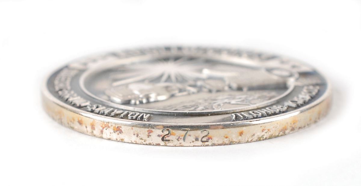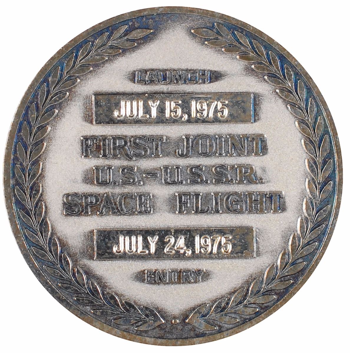 Unflown sterling silver Apollo-Soyuz Robbins Medal, approximately 1.25? in diameter, with a raised design on the face of the mission insignia, and the mission and astronauts’ names in both English and Cyrillic. The reverse is engraved with the launch and entry dates, as well as “First Joint U.S.-U.S.S.R. Space Flight.” Medal is serial numbered on the rim, “272,” and includes its original matching case. Condition is mint state, with some toning to rim and inscription field. Accompanied by a signed letter of provenance from Dave Scott, in part: “I hereby certify that the Apollo Suyoz Test Project (ASTP) Silver Medallion No. ‘272’ included with this letter is from my personal collection and represents the first mission of international cooperation flown by the United States and the Soviet Union...I specifically requested the ASTP number ‘272’ included with this letter.”