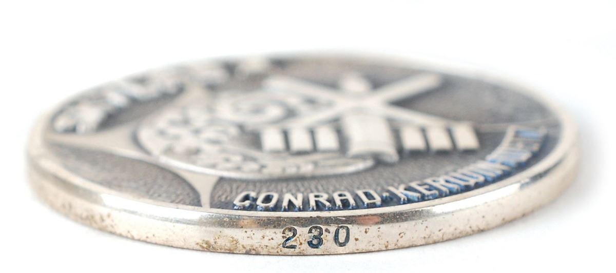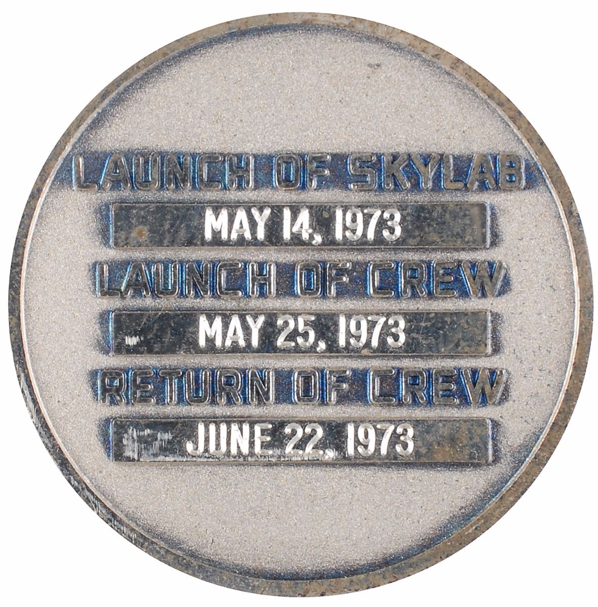Unflown sterling silver Skylab 1 Robbins medal, approximately 1.25? in diameter, with a raised design of the mission insignia on the face, and engraved on the reverse with the Skylab launch date of May 14, 1973, the crew launch date of May 25, 1973, and the crew return date of June 22, 1973. The medal is serial numbered “230” on the rim and includes its original matching case. Condition is mint state. Accompanied by a signed letter of provenance from Dave Scott, in part: “I hereby certify that the Skylab I sterling silver medallion number ‘230’ included with this letter...represented the first mission to the United States’ first space station, Skylab...I specifically requested the Skylab 1 number ‘230’ included with this letter which has been in my personal collection since returning to Earth.” Scott requested number 230 to have a consistent collection and the number represented a Mercedes 230SL for which he had aspirations.
