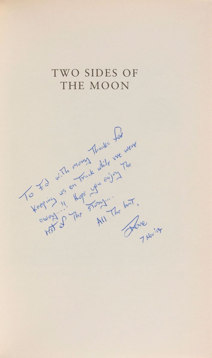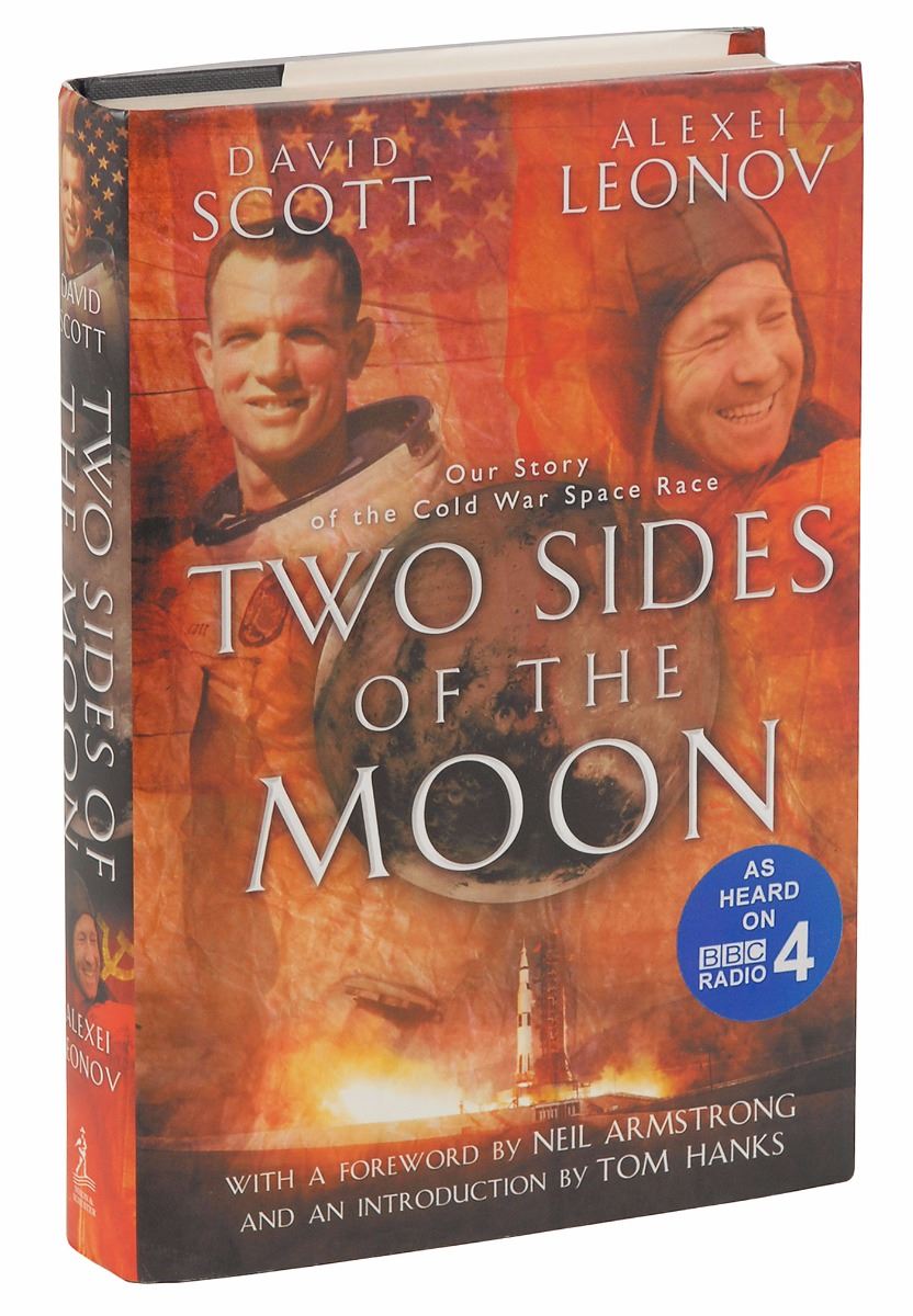 Signed book: Two Sides of the Moon. First British edition. London: Simon & Schuster, 2004. Hardcover with dust jacket, 5.75 x 8.75, 415 pages. Signed and inscribed to Apollo 14 LMP Edgar Mitchell on the half-title page in blue ballpoint, "To Ed, with many thanks for keeping us on track while we were away…!! Hope you enjoy the rest of the story…All the best, Dave, 7 Nov '04." In fine condition. Accompanied by a certificate of authenticity from the Dr. Edgar Mitchell estate sale. A fantastic union between two Apollo moonwalkers. Pre-certified Zarelli Space Authentication.