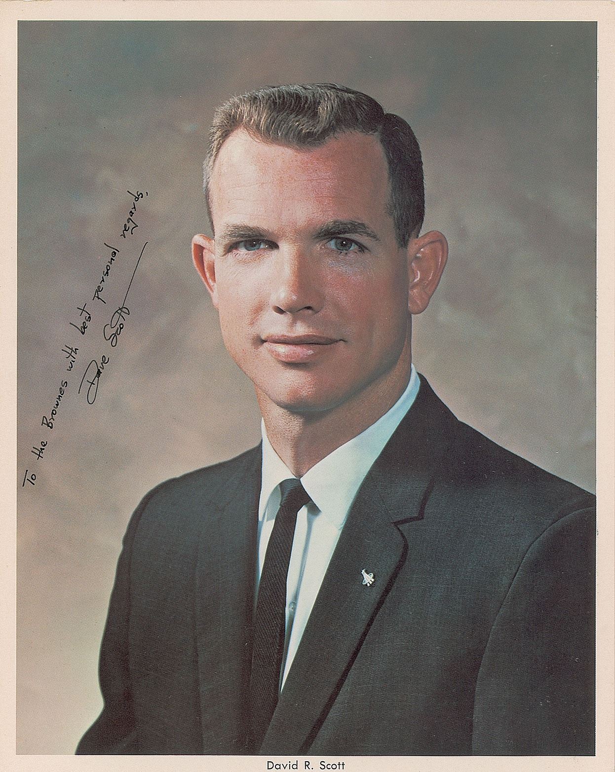Official color vintage 8 x 10 NASA lithograph of Scott with his astronaut pin on his lapel, signed and inscribed in black ink, "To the Brownes with best personal regards, Dave Scott.” Reverse bears typed collector's notation indicating that it was signed in 1965. In fine condition, with a paperclip impression to the top edge.