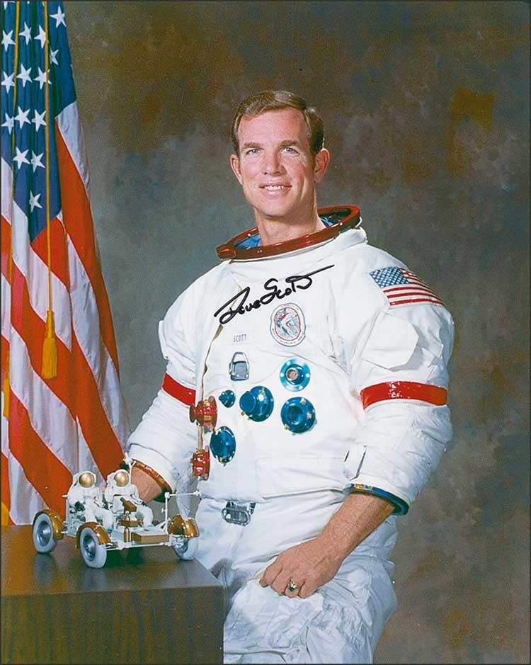 Color glossy 8 x 10 photo of Scott posing in his flight suit with a model of the lunar rover, signed in black felt tip. In fine condition. Probably the toughest moonwalker to now obtain. Pre-certified Scott Cornish and RRAuction COA.