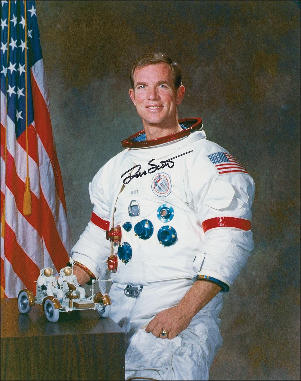 Color glossy 8 x 10 photo of Scott in his space suit posing with a model of a lunar rover, signed in black felt tip. In very fine condition.