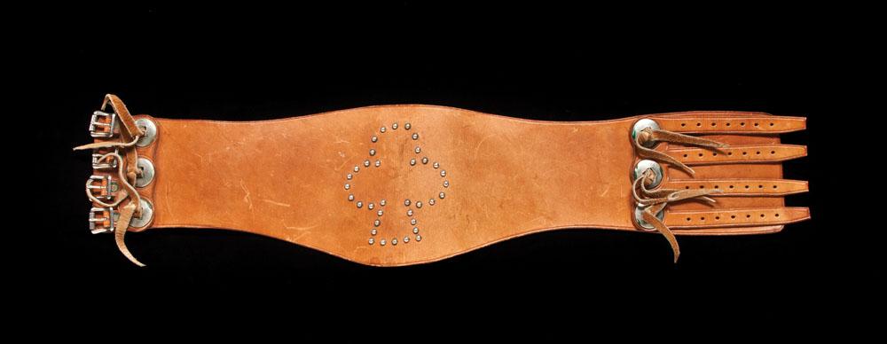 Four buckle belt with studded club at center. Belt is 7” at swell with 3 nickel conchos at each end. Excellent condition with like new color. Well marked with the scarce Cody Wyoming makers-mark, c. 1930s.