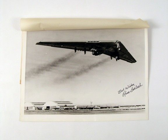 The legendary artist Dave Stevens was obsessed with anything to do with flying. Especially when it came to the heroes of the "Right Stuff", and those that came long before. Of course these all became his inspiration for his masterwork, "The Rocketeer". Steven especially was intrigued by the "Flying Wing". He was overjoyed when he was able to meet one of the greatest test pilots of all time, Colonel Russell E. Schleeh, who actual flew the Flying Wing in the late 1940s. At that meeting Colonel Schleeh gave Stevens an extremely rare oversized photo of the Flying Wing and autographed it for him. Autographs by Colonel Schleeh are extremely rare indeed, as is this photo. Stevens cherished this for the rest of his short life. This autographed photo comes from the Dave Steven Estate, and includes a Certificate of Authenticity from the Estate. (Photo is approx. 14"x11").