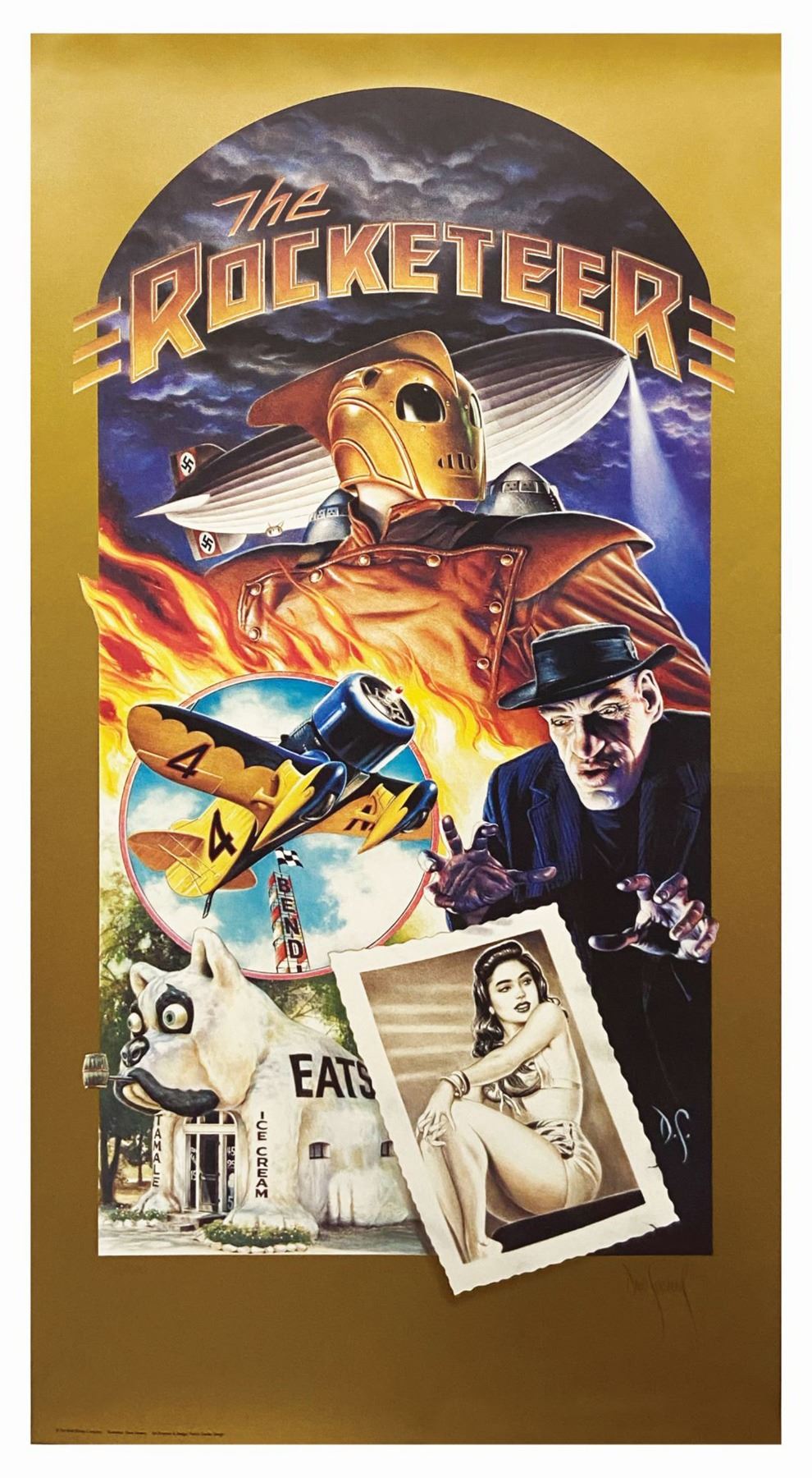 (Disney, 1991) A limited edition art print by Rocketeer-creator Dave Stevens commemorating the release of The Rocketeer motion picture. Inspired by 1930s movie posters, Stevens juxtaposes elements from the film including Lothar, Jenny, and a Nazi zeppelin for an action-packed composition created using both offset lithography and serigraph printing methods. The artist has signed his name in pencil at lower right below the artwork, and it is numbered 41/500 at lower left. The piece is accompanied by a Disney Certificate of Authenticity. Measuring 39"x20", it is in very fine condition with minimal wear.