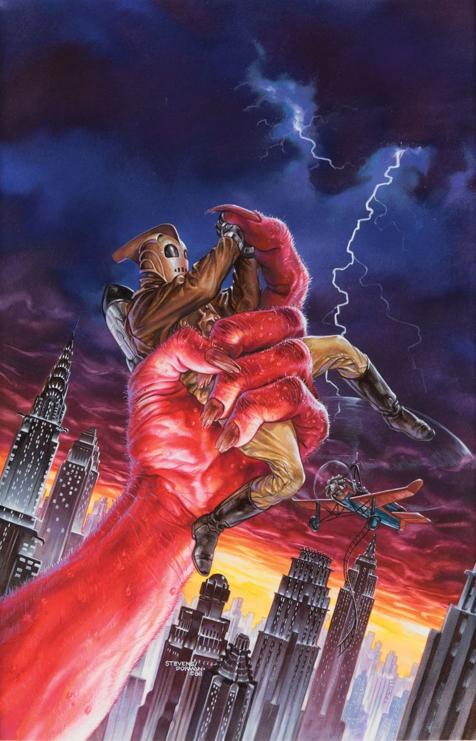 94. Dave Stevens and Dave Dorman original cover painting for Rocketeer Adventure Magazine #2. (Comico/Dark Horse, 1988) Accomplished in mixed media on 12.5 x 18 in. art board. Presented in an attractive red and black mat. Art by the late Dave Stevens is very highly sought after, and of course, the "Rocketeer" is his signature character. This large and beautiful painting is achingly detailed and represents an opportunity to acquire a major work by this legend at a very reasonable opening bid. The Rocketeer is seen here in peril, in the hands of an unknown creature, over the dark and foreboding skies of New York City with a bi-plane and lightning bolts in the background. Signed, "Stevens/Dorman 88". In very good condition. $4,000 - $6,000