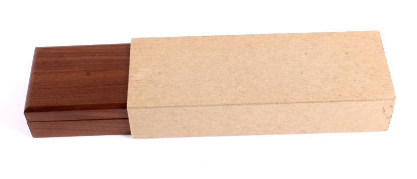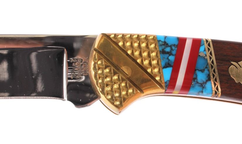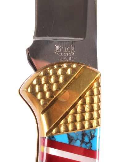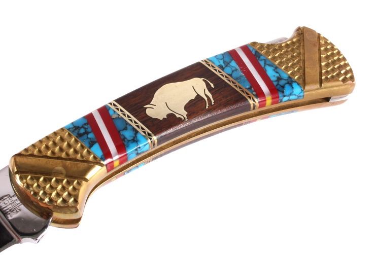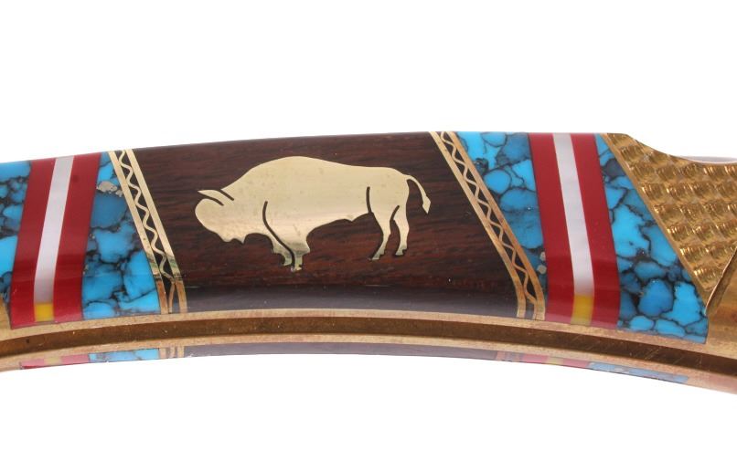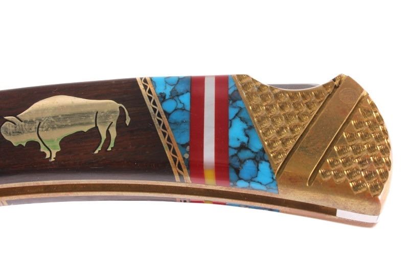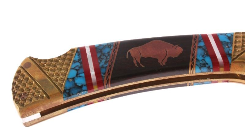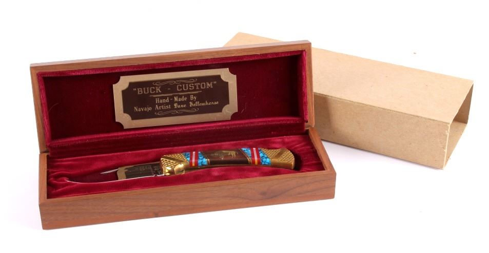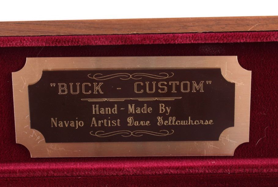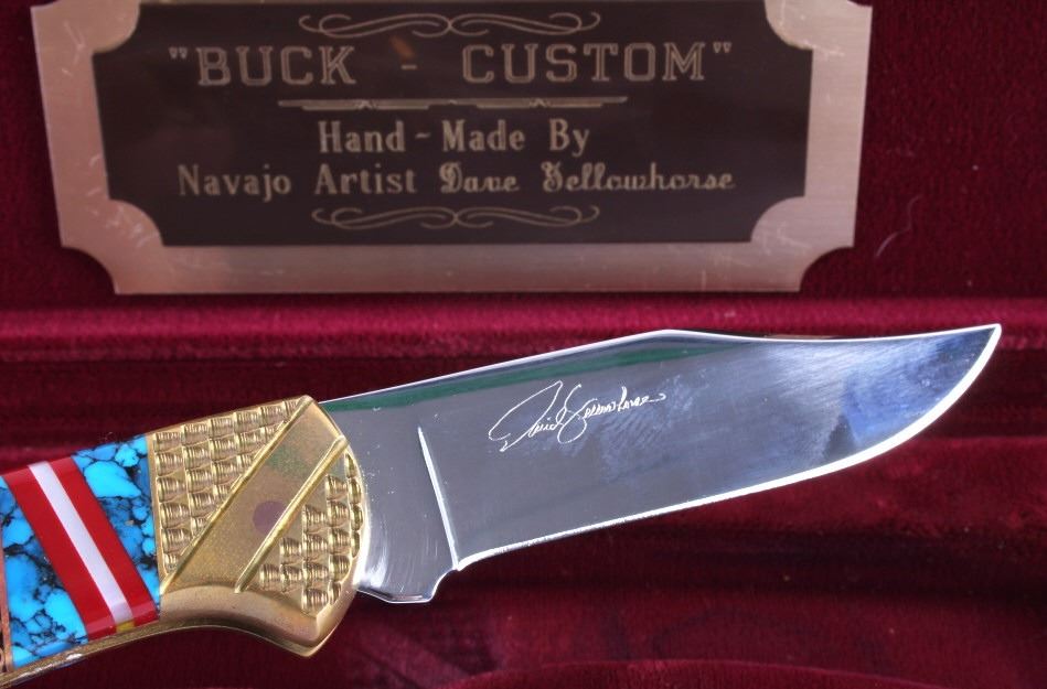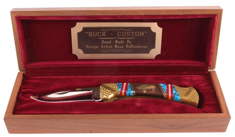 This is an original rare hand crafted Buck Custom knife from Navajo Native American Indian artist, Dave Yellowhorse. The knife shows an inlaid mosaic handle with rich gem quality turquoise, black onyx, rosewood, ox blood coral, and etched brass. The handle also shows the Buffalo inlaid in brass. The knife has a Buck Custom U.S.A. stainless steel blade which is signed "David Yellowhorse". The piece comes in a custom wood box with etched brass label. The knife is 7 3/8"L when open with a 3" blade and 4.25"L when closed. The box is 3"x9 1/8" and 1.75" thick. Rare piece.