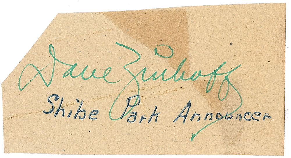 Colorful Philadelphia public address announcer (1910–1985) best remembered as the announcer for Wilt Chamberlain's 100 point game. Vintage fountain pen signature, “Dave Zinkoff,” on an off-white 3 x 1.25 slip clipped from an album page, affixed to a white 5 x 3 card. In very good condition, with a couple blocks of toning affecting the end of the signature.
