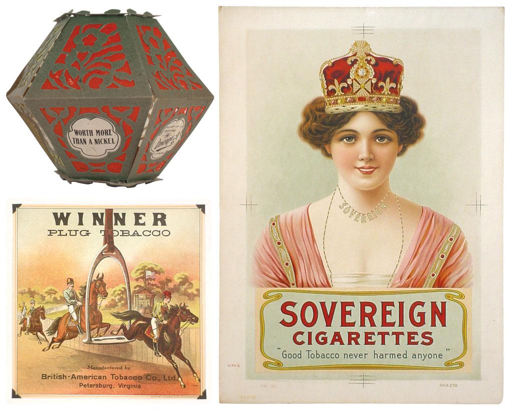 Davenport Cigar candle lamp shade, cdbd w/6 adv panels, Sovereign Cigarettes litho on cdbd printer's proof & Winner Plug Tobacco litho on paper sign, shade in Good cond & 10"H x 12"W, other 2 in Exc cond, 19"H x 13"W & 10.5"Sq.