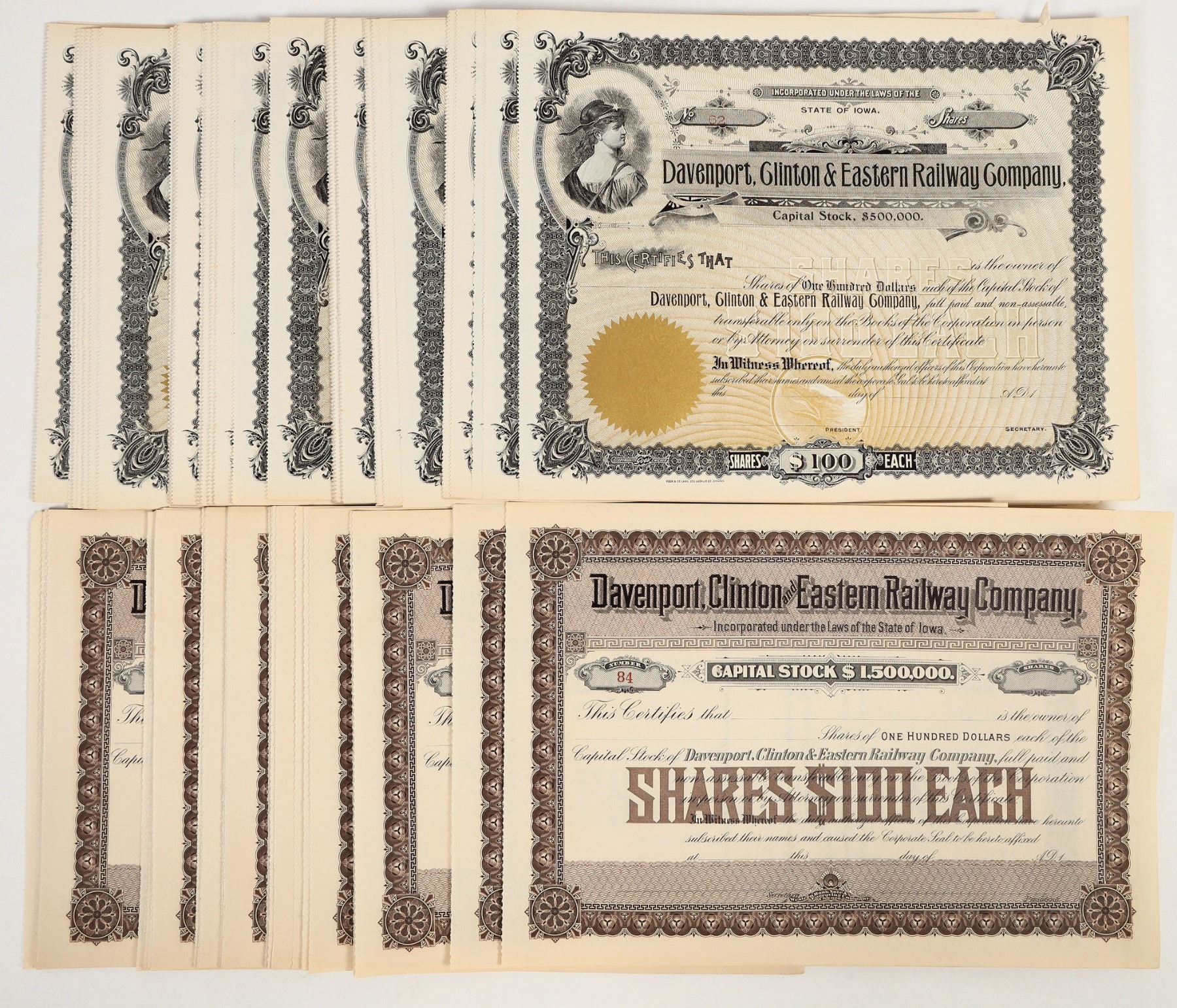 Approx 100. All U/U. Dateline 1___. Fine or better. Davenport, Clinton & Eastern Railway, Keen & De Lang printer. Two varieties.