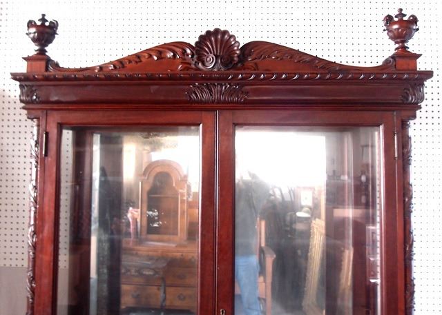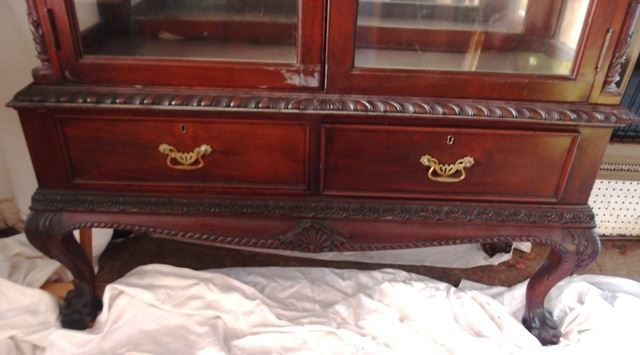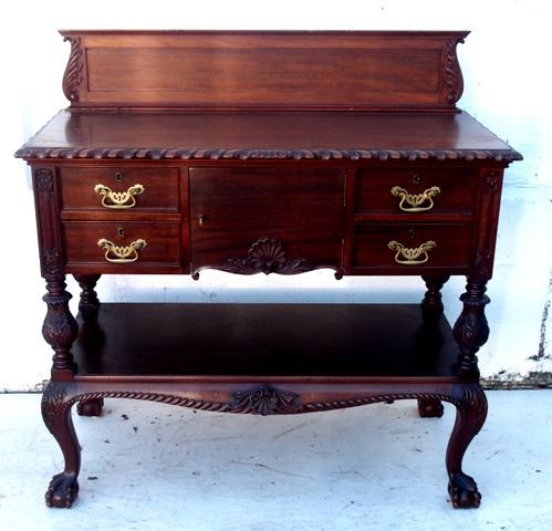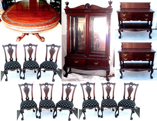 Monumental Boston made Davenport Dining room set, antique c. 1880s. This set includes a magnificant carved claw foot round to oval dining table with grape vine carving, rope border, and carved skirt, carved ball and claw feet, and fully carved pedestal, matching china cabinet, fully carved with 3 dimensional urn finials, carved crest, 2 doors, and 1 drawer, plus fully carved ball and claw feet, 2 matching servers, with back splash, rope border, ball and claw feet, matching carvings throughout, and nine matching carved side chair and one arm chair. 2 matching servers on ball and claw feet, matching carvings that match the table. Table top has grape vine carving, round table with leaves to expand to oval size. Urn finials on China cabinet, full mirror back, matching ball and claw feet, one drawer. Fabulous matching carvings throughout set, including rope borders and seashells, matching hardware, monumental set! The family's great grandfather purchased this set in Boston and it has been in the family ever since! This is a fabulous set, attributed to A.H. Davenport Furniture Makers, Boston, MA, founded in 1880, was one of the nation's premiere makers of expensive, Gilded Age Victorian furniture, furnishing ornate mansions, elite clubs, banks, and famous estates. It is rare to find a complete set that has been owned by the same family, in such wonderful condition! Don't miss out on this one! The table measures 60" round, opens with 3 leaves which measures 14" each, leaves are skirted, massive ball and claw feet with split pedestal which opens to reveal a center leg for support with ball and claw foot. This set was more than likely custom made to have matching servers. The servers measure 43" wide x 36" tall with 8 1/2" tall back splash, all over carved to match set. The China cabinet comes in 2 sections and measures approx. 78" tall x 51" wide with full mirror back and 4 adj. shelves with plate rails, all carved. The seats are a bee pattern and the chairs are heavily carved to match the set. The chairs measure approx. 19" wide, 42" tall and 17" deep. This set could be used in board room, dining room, or many differed uses in today's life. The set all retains the original finish and in a high retail environment would sell for $20,000 to $25,000! We have never had a set like this one in 38 years of business!