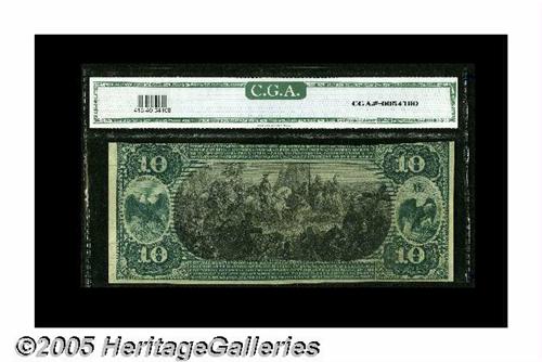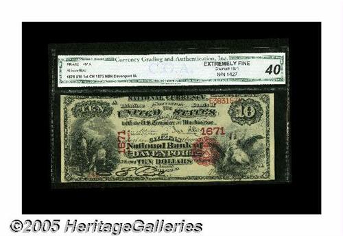<B>Davenport, IA</B></I> - $10 1875 Fr. 418 <B>The Citizens NB</B></I> Ch. # 1671<BR>First Charters and Brown Backs only from this tough Davenport bank, which liquidated in 1906. This is, by no means, a common type and denomination from Iowa, with this example one of the nicest of the 27 recorded examples in the new Kelly census. It's been graded and encapsulated by CGA, which labels this as <B>Extremely Fine 40,</B></I> a grade that appears conservative in the extreme, despite the fact that the note is slightly trimmed into the design at the top.