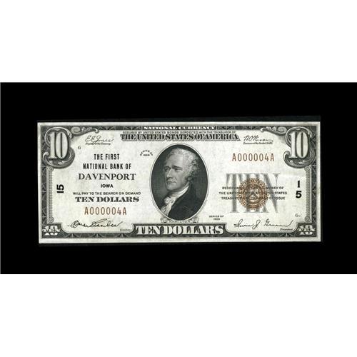 <B>Davenport, IA</B></I> - $10 1929 Ty. 1 <B>The First NB</B></I> Ch. # 15<BR>A second low charter example, this with a single digit serial number A000004A. <B>Choice Crisp Uncirculated.</B></I>