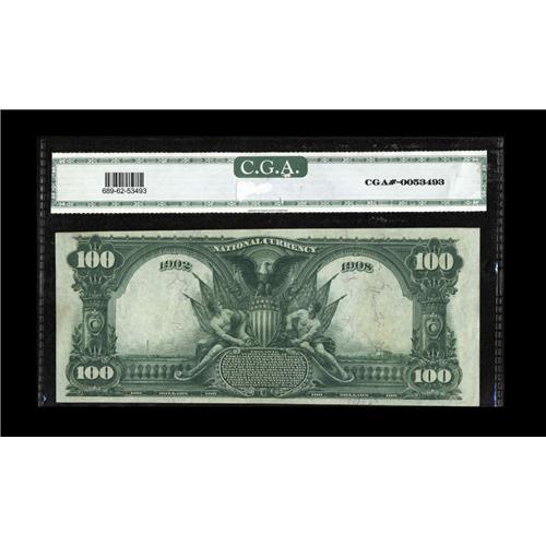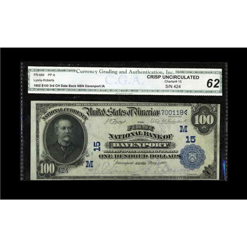 <B>Davenport, IA</B></I> - $100 1902 Date Back Fr. 689 <B>The First NB</B></I> Ch. # (M) 15<BR><B>CGA Crisp Uncirculated 62.</B></I> The supply of $100 large Nationals in any grade is inadequate, in uncirculated condition the paucity is extreme, resulting in severe upward pressure on prices.