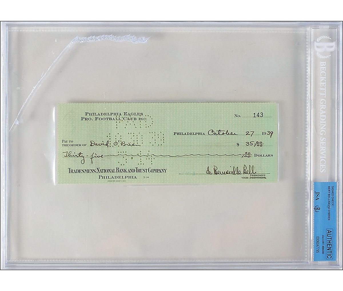 Philadelphia Eagles business check, 8.25 x 3, filled out in another hand and signed by Bell, “de Benneville Bell,” payable to David O’Brien (1938 TCU Heisman Trophy winner) for $35.00, October 27, 1939. Check is endorsed on the reverse by O’Brien. Check is housed in a cracked 13 x 9.5 Beckett authentication holder. A central vertical fold and expected stamps and cancellation holes, not affecting either signature, otherwise fine condition.