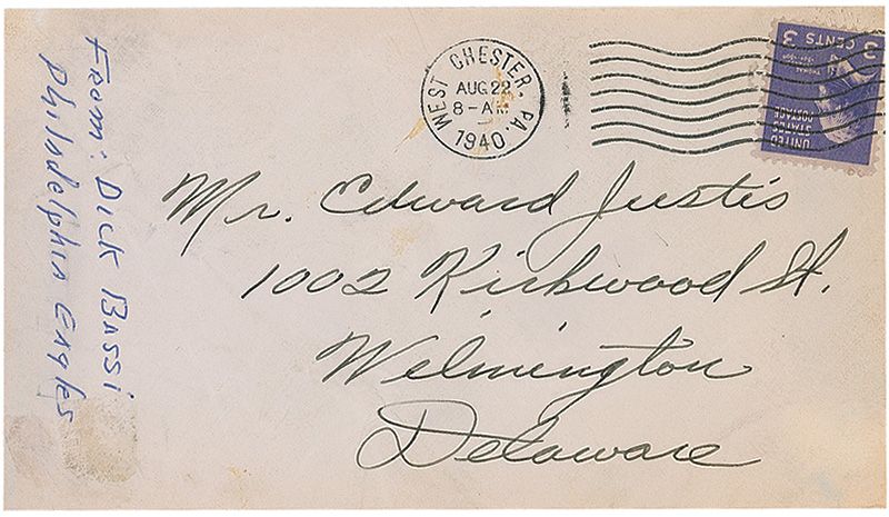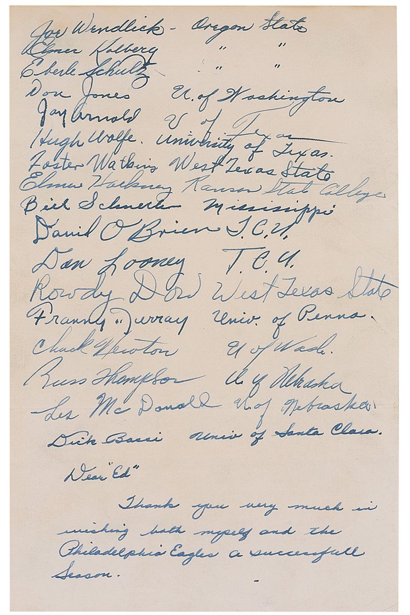 College Football Hall of Famer (1917–1977) and 1938 Heisman Trophy winner who played college football at Texas Christian University. Scarce vintage fountain pen signature, “David O’Brien T.C.U.,” on an off-white 5.75 x 9 sheet also signed by 16 others, many of whom were O’Brien’s teammates with the Philadelphia Eagles, with a brief note from Dick Bossi at the bottom of the sheet. In fine condition, with two horizontal folds and some scattered light toning and creasing. Accompanied by the original mailing envelope. After just two seasons with the Eagles, O'Brien retired from football to become an agent with the FBI, where he worked for ten years.