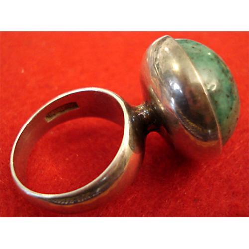 This is a Sterling .925 Silver ring with Amazonite stone from the David-Andersen Company in Norway. Hefty at 13.4g, designer is Karl Jorgen Otteren who was active in the 60s with the company. The ring bears his mark "KJOTTEREN" as well as the .925 Sterling mark. The ring is approximately a Size 7 with interior diameter .685 inches. It is in excellent condition with minimal signs of wear. There may be a play on words with the marking since "Klotteren" means "doing your Christmas shopping" in some dialects of Dutch and the "J" in the mark distinctly resembles an "L". This is of course open for debate.