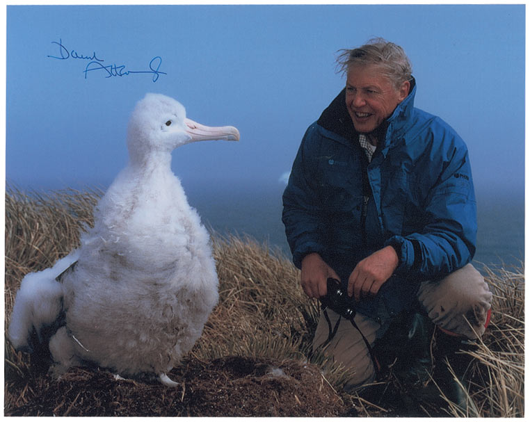 British broadcaster and naturalist (May 8, 1926), who has enjoyed a successful 50–year career as the voice of natural history programs for the BBC. Color satin-finish 10 x 8 photo of Attenborough with one of his feathered friends, signed in blue felt tip. In fine condition, with a small scratch towards the lower left corner.