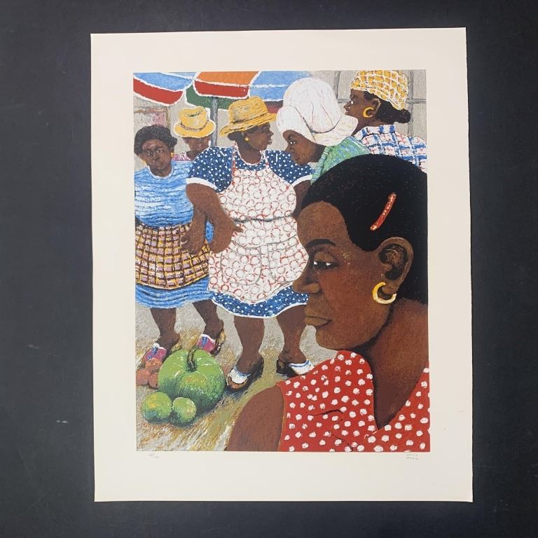 David Azuz's "La Guadeloupe" limited edition print, signed lower right and numbered 68/200 lower left. This piece is of a woman in the foreground, looking left, with other women in the background talking amongst themselves, with some fruit on the ground. This piece is in excellent condition.