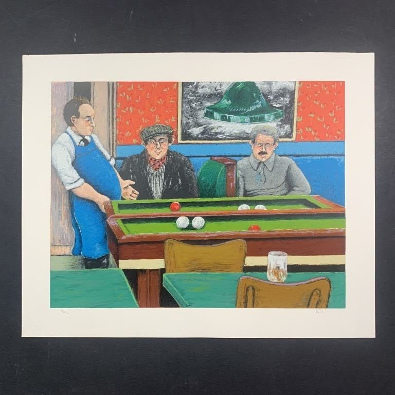 David Azuz's "Pool Hall" limited edition print, signed lower right and numbered 16/200 lower left. This piece is of a scene inside a pool hall, where a bartender is speaking with two patrons, in front of a pool table. This piece is in excellent condition.