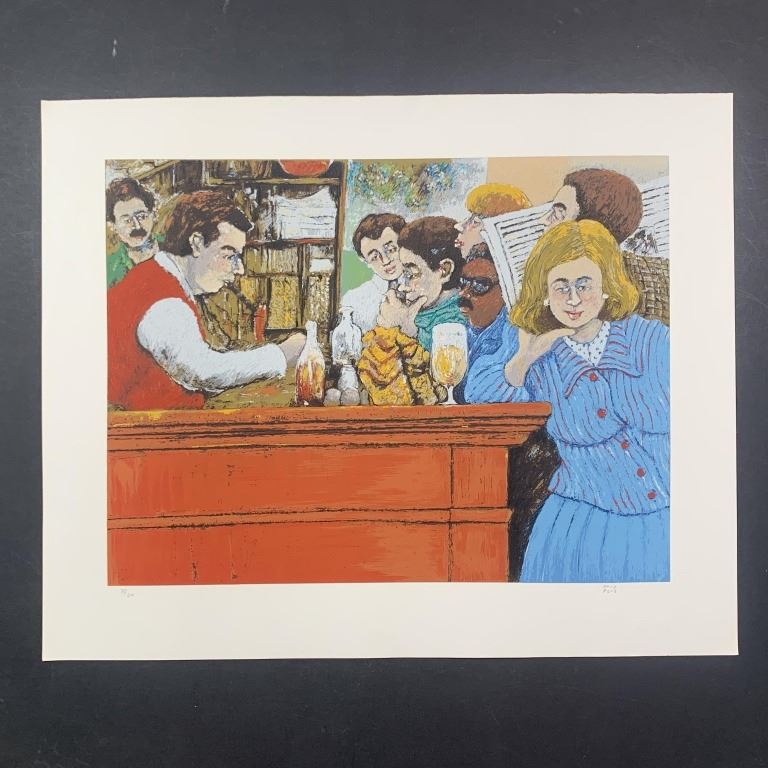 David Azuz's "The Select Montparnasse" limited edition print signed lower right and numbered 75/200 lower left. This piece is of a woman in a blue dress, sitting at the edge of a busy bar, with the bartender serving a number of patrons behind her. This piece is in excellent condition.
