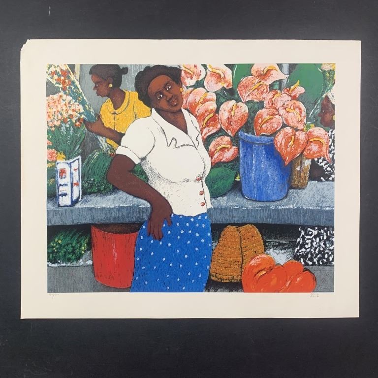 David Azuz's "Tropical Flowers" limited edition print, signed lower right and numbered 130/200 lower left. This piece is of two women, selling tropical flowers at a stand. This piece is in near excellent condition wiht some minor damage to upper left corner.