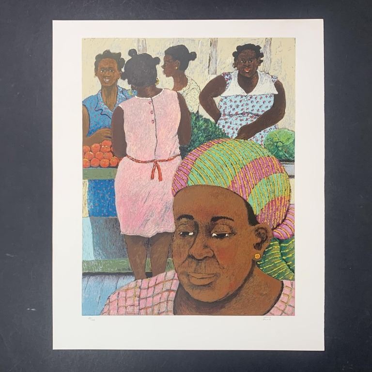 David Azuz's "Women of Guadeloupe" limited edition print signed lower right and numbered 88/200 lower left. This piece is of a woman with a purple, green and yellow head covering, in front of a few women who are sifting through fruit on a stand in the background. This piece is in excellent condition.