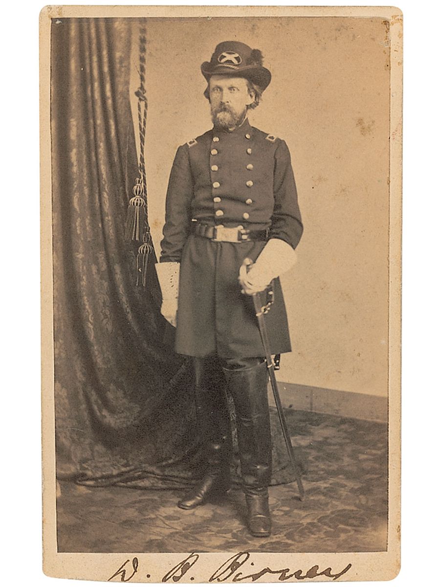 Union general (1825–1864). Colonel of the 23rd Pennsylvania Infantry. He fought as a division commander of General Sickles 3rd Corps at Gettysburg, and took command of the corps after Sickles was seriously wounded. He also served with distinction with the Army of the Potomac in the 1864 Overland campaign; he was stricken with malaria and died on Octobert 18, 1864. Rare original 2.5 x 4 carte-de-visite full-length portrait of Birney in uniform by R. W. Addis of Washington, signed in the lower border in black ink, “D. B. Birney.” In fine condition, with a surface impression to the top and a couple areas of surface loss to reverse.