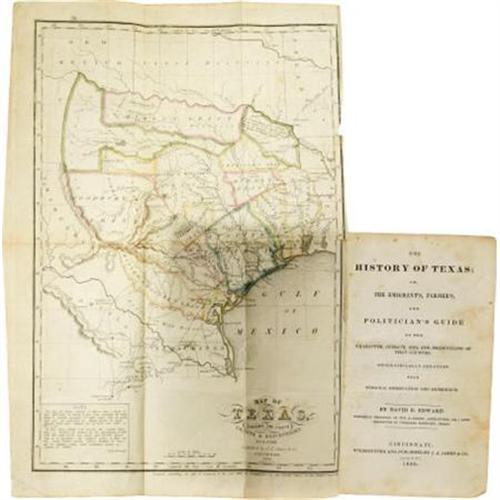 <B>David B. Edward: </B></I><B><I>The History of Texas;</B></I></B></I> <I>or, The Emigrant's, Farmer's, and Politician's Guide to the Character, Climate, Soil and Productions of That Country: Geographically Arranged from Personal Observation and Experience. </B></I>(Cincinnati: Stereotyped and Published by J.A. James & Co., 1836). First edition. Twelvemo (7" x 4.25"). 336 pages. Contains final page of ads which is often missing. Illustrated with the large colored folding map of Texas by E.F. Lee (12.5" x 8.5") containing the latest grants and discoveries. This is one of the earliest separate maps of Texas, published shortly after its Independence.<BR><BR>C.W. Raines accurately termed it 'one of the few choice early histories of Texas, though the author was rather Mexican in his politics.' "In addition to giving what was to that date the most accurate description of the land, settlements, and economy of Texas, Edward devotes considerable space to colonization regulations and activities." "David B. Edward was born in Scotland, lived in the West Indies and Columbia, and settled in Louisiana in 1819. He moved to Texas in 1830 and became principal of one of the earliest schools in Texas in Gonzales. It was in this town, center of Mexican, Irish, and Anglo-American activities, that he prepared his book, although he obviously did some of the research in New Orleans. Conditions just prior to the Revolution described by an actual observer. One of the cornerstones of any Texas collection. Streeter calls this work 'one of the essential Texas books.' Edward describes Texas on the eve of its War of Independence; unlike many emigrant's guides however Edward writes from first-hand experience. <BR><BR>Contemporary and possibly publisher's binding of dark brown diced paper boards with printed paper spine label. Binding worn with some loss at the joints and corners, general chipping and scuffing including to the label, which is also darkened. Penmanship practice on the rear free endleaf, a bit of minor foxing and soiling, a few short tears to the map edges, but altogether an excellent very good copy. Housed in a brown cloth clamshell case with a morocco label lettered in gilt. Description mounted to the inside of the case. One of the best accounts of Texas on the eve of the revolution, this also includes the early actions in the revolt through 1835. <I>From the collection of Darrel Brown.</B></I><BR><BR><B>Reference:</B></I> Streeter <I>Texas</B></I> 1199. <I>Basic Texas Books</B></I> 53. Howes E48. Sabin 21886.<BR><BR><b>Shipping:</b> Books & Catalogs (<a target="_blank" href="http://www.heritageauctions.com/common/shipping.php">view shipping information</a>)