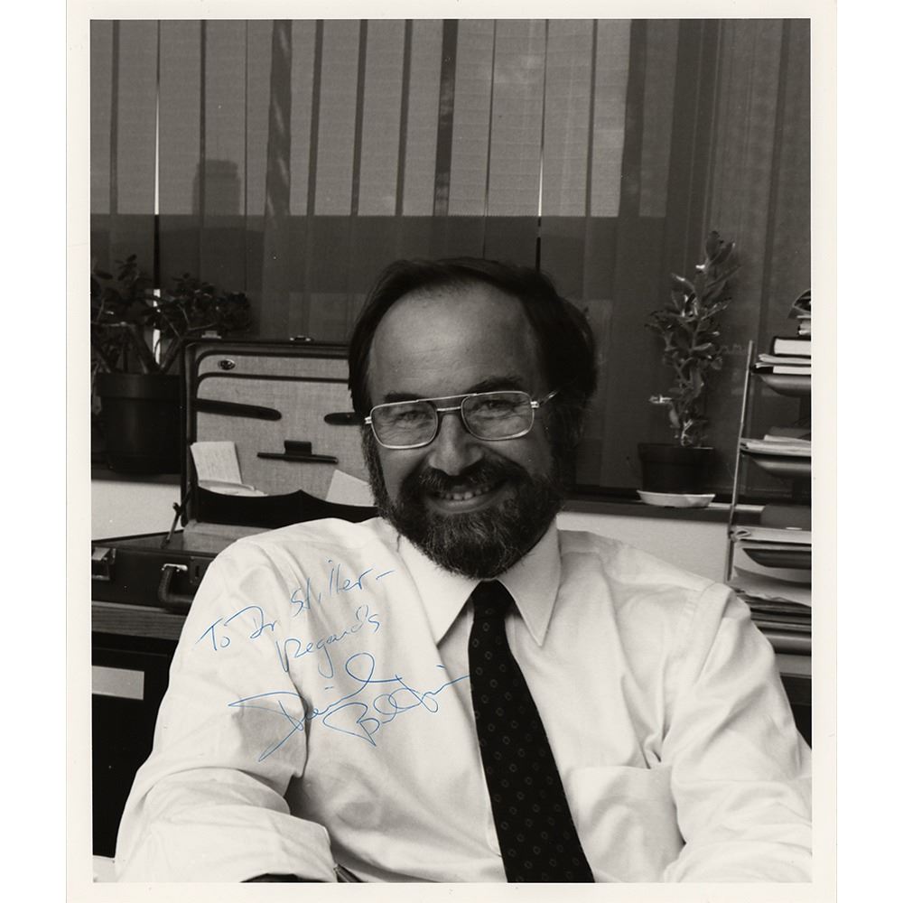 American biologist (born 1938) who shared the 1975 Nobel Prize in Physiology or Medicine for 'discoveries concerning the interaction between tumor viruses and the genetic material of the cell.' His greatest contribution to virology was his discovery of reverse transcriptase which is essential for the reproduction of retroviruses such as HIV. Glossy 8 x 10 photo of Dr. Baltimore in his office, signed and inscribed in blue ballpoint, "To Dr. Stiller, Regards, David Baltimore.” In very fine condition.
