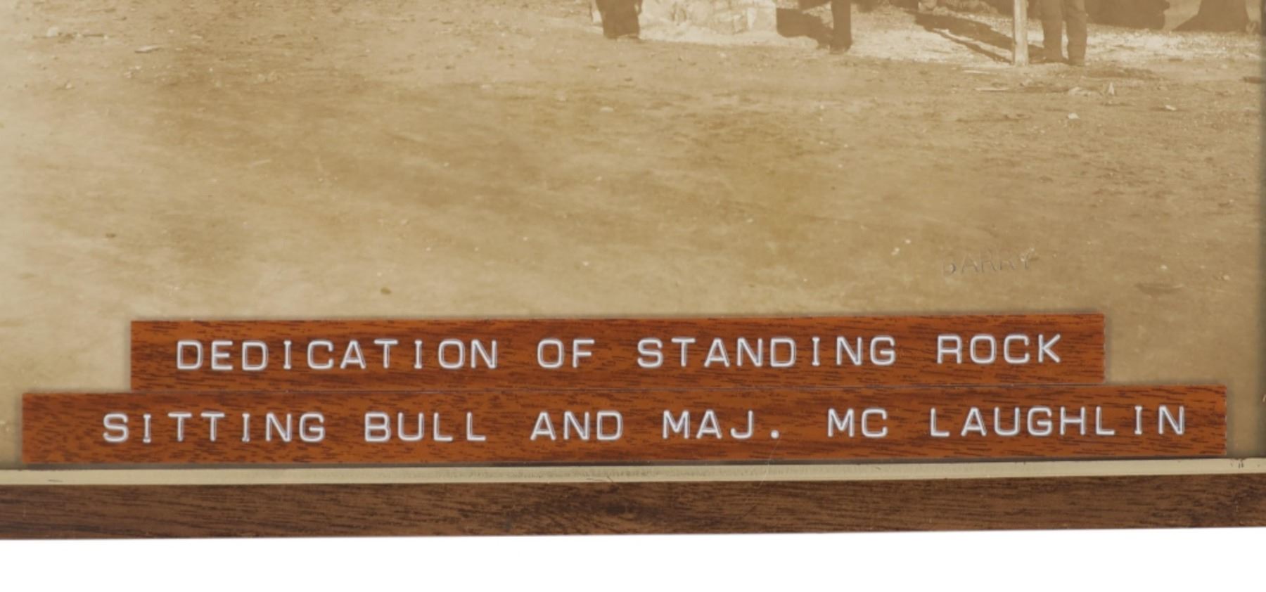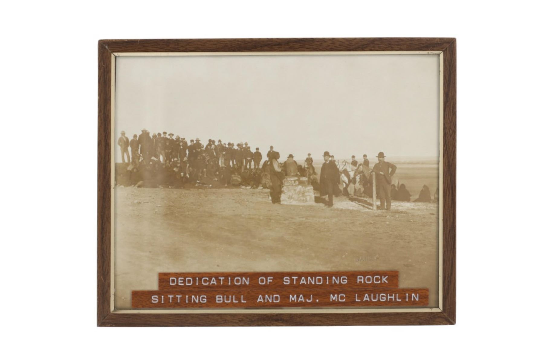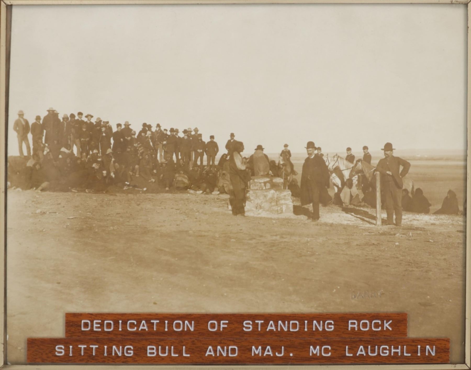 Featured in this lot is this "Dedication of Standing Rock Sitting Bull, Major Mclaughlin, and Louis Primo," by American photographer David Francis Barry born in 1854 and died in 1934; from the ex-collection of the C.M. Russell Museum and John Kleinschmidt. The photograph features a wonderfully and professionally crafted silver gelatin construction that is blind stamped 'BARRY' in the right hand bottom corner and shows a group of Native Americans in the distance with Sitting Bull and Major Mclaughlin with the interpreter Louis Primo in the foreground. "Stone being placed on monument at the Standing Rock Agency, North Dakota; Agent James McLaughlin on right of marker, Sitting Bull on left, and Joe Primeau (interpreter) leaning against post; Dakota Native Americans sitting on ground wrapped in blankets, United States military soldiers atop horses, and other men and children in group gathered around." - Denver Public Library. The photograph comes complete with correspondence from Mr. John Kleinschmidt To David Francis Barry himself discussing this photograph and others; These two were in constant contact as collectors and historians as well as correspondence from Vincent Mercaldo another historian and Mr. Kleinschmidt discussing a pamphlet sent to him by Mr. Mercaldo. Provenance: From the John Kleinschmidt collection which was on loan to the C.M. Russell Museum from 1987 to 1993 and included in the "The Cowboy West: 100 Years of Photography 1992-1993 exhibit. The condition of this D.F. Barry photograph is well preserved with no obvious signs of damage to the photograph and shows minimal wear to the frame. The measurements of this framed photograph is 8 1/8" x 10 1/4" and the visible photograph measures 7 1/8" x 9 1/8". The collective weight of this photograph is 14oz.