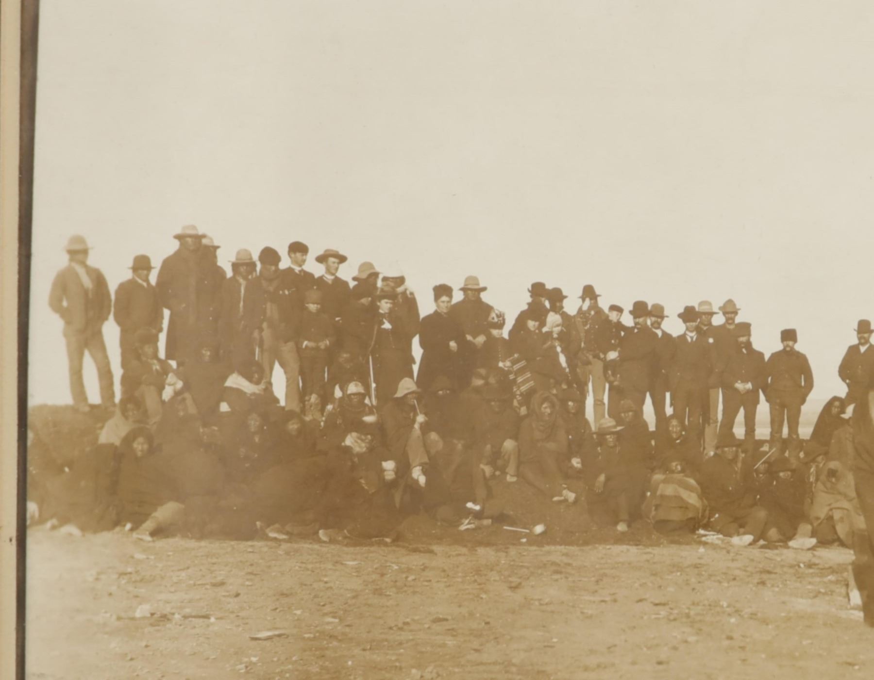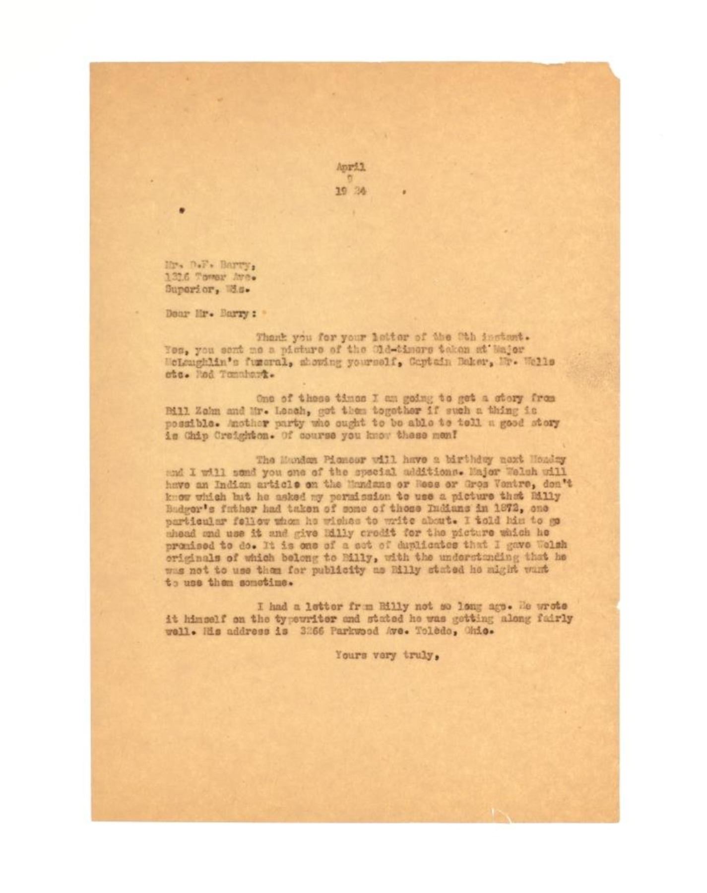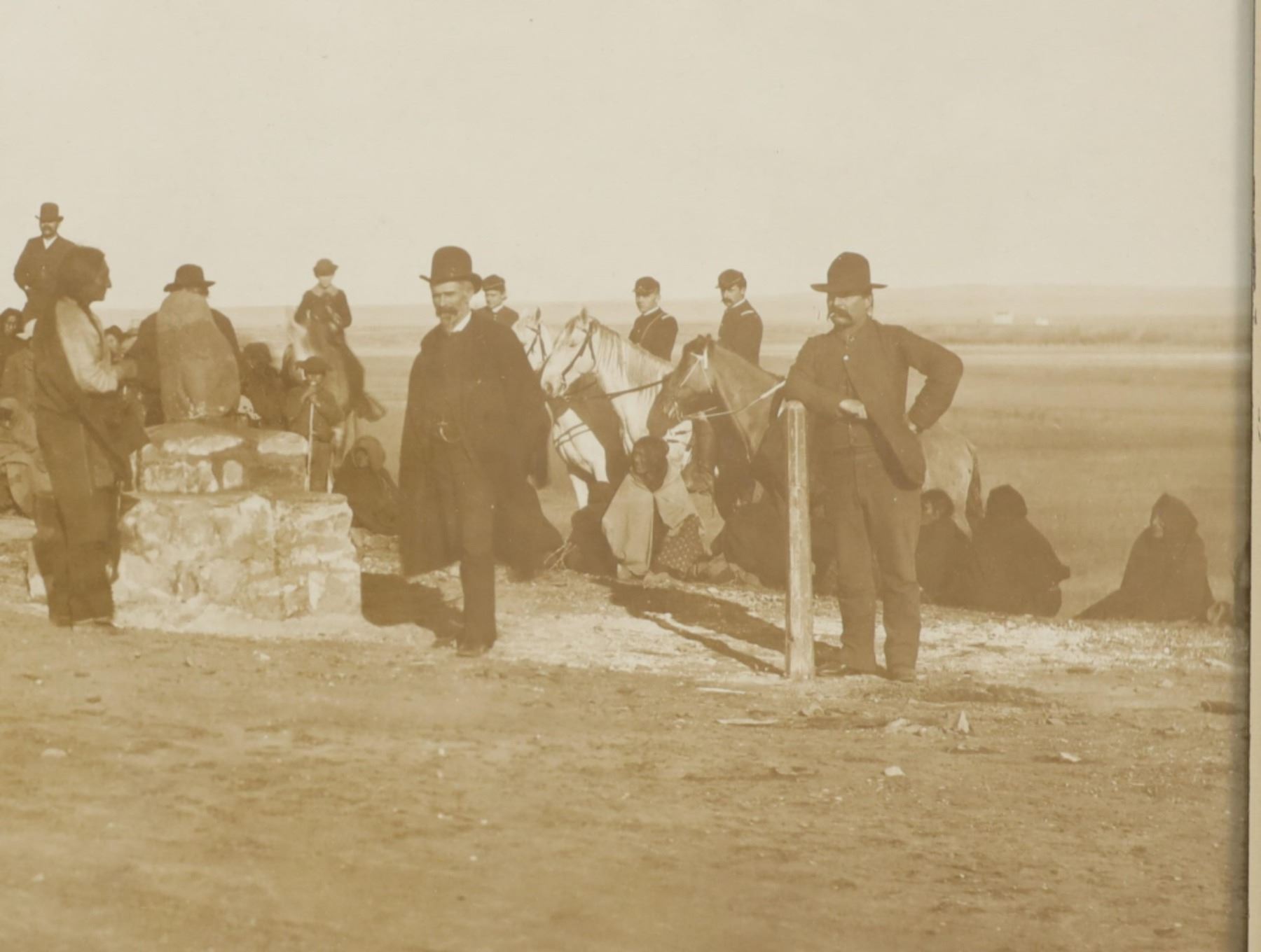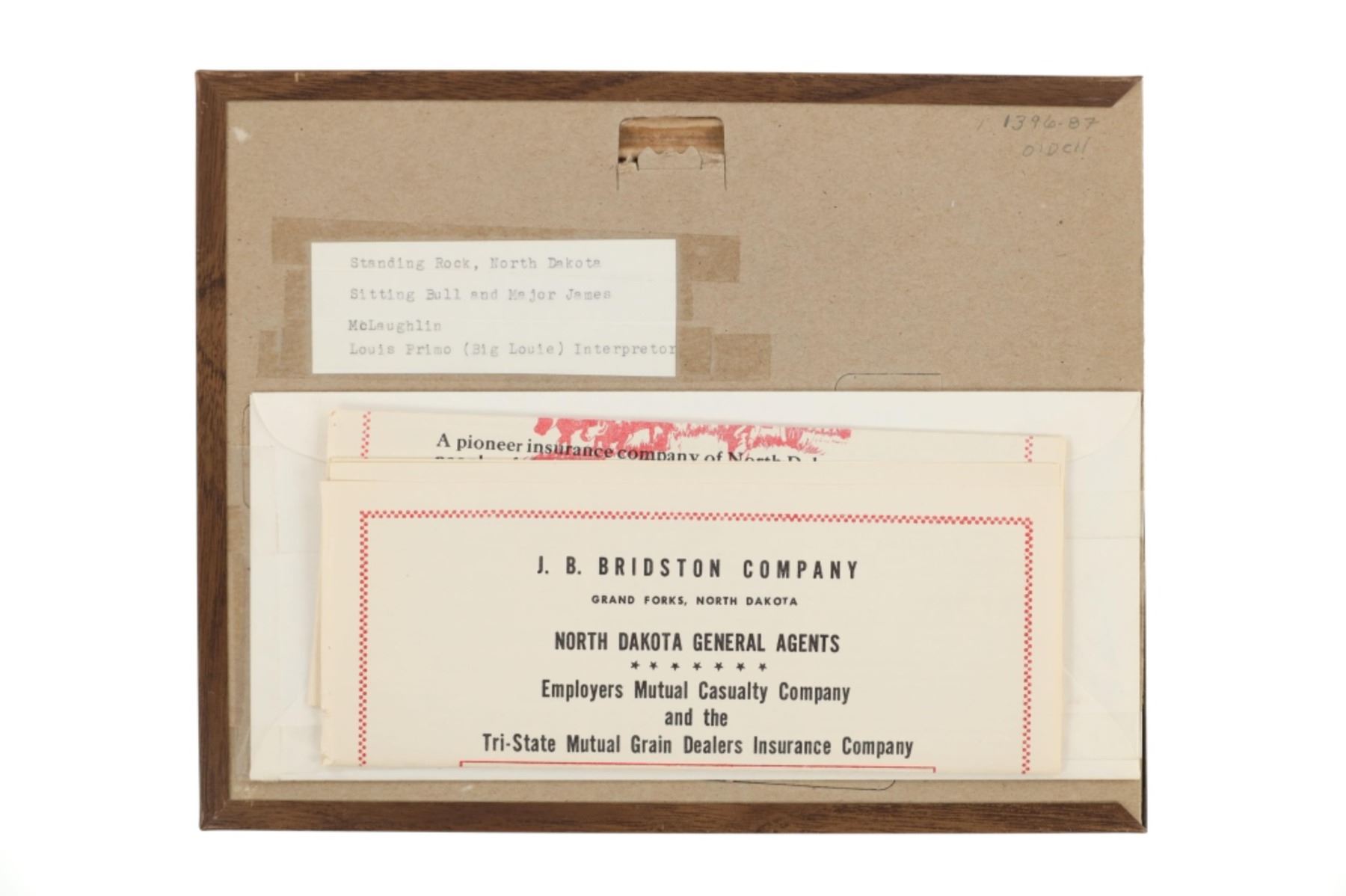 Featured in this lot is this "Dedication of Standing Rock Sitting Bull, Major Mclaughlin, and Louis Primo," by American photographer David Francis Barry born in 1854 and died in 1934; from the ex-collection of the C.M. Russell Museum and John Kleinschmidt. The photograph features a wonderfully and professionally crafted silver gelatin construction that is blind stamped 'BARRY' in the right hand bottom corner and shows a group of Native Americans in the distance with Sitting Bull and Major Mclaughlin with the interpreter Louis Primo in the foreground. "Stone being placed on monument at the Standing Rock Agency, North Dakota; Agent James McLaughlin on right of marker, Sitting Bull on left, and Joe Primeau (interpreter) leaning against post; Dakota Native Americans sitting on ground wrapped in blankets, United States military soldiers atop horses, and other men and children in group gathered around." - Denver Public Library. The photograph comes complete with correspondence from Mr. John Kleinschmidt To David Francis Barry himself discussing this photograph and others; These two were in constant contact as collectors and historians as well as correspondence from Vincent Mercaldo another historian and Mr. Kleinschmidt discussing a pamphlet sent to him by Mr. Mercaldo. Provenance: From the John Kleinschmidt collection which was on loan to the C.M. Russell Museum from 1987 to 1993 and included in the "The Cowboy West: 100 Years of Photography 1992-1993 exhibit. The condition of this D.F. Barry photograph is well preserved with no obvious signs of damage to the photograph and shows minimal wear to the frame. The measurements of this framed photograph is 8 1/8" x 10 1/4" and the visible photograph measures 7 1/8" x 9 1/8". The collective weight of this photograph is 14oz.