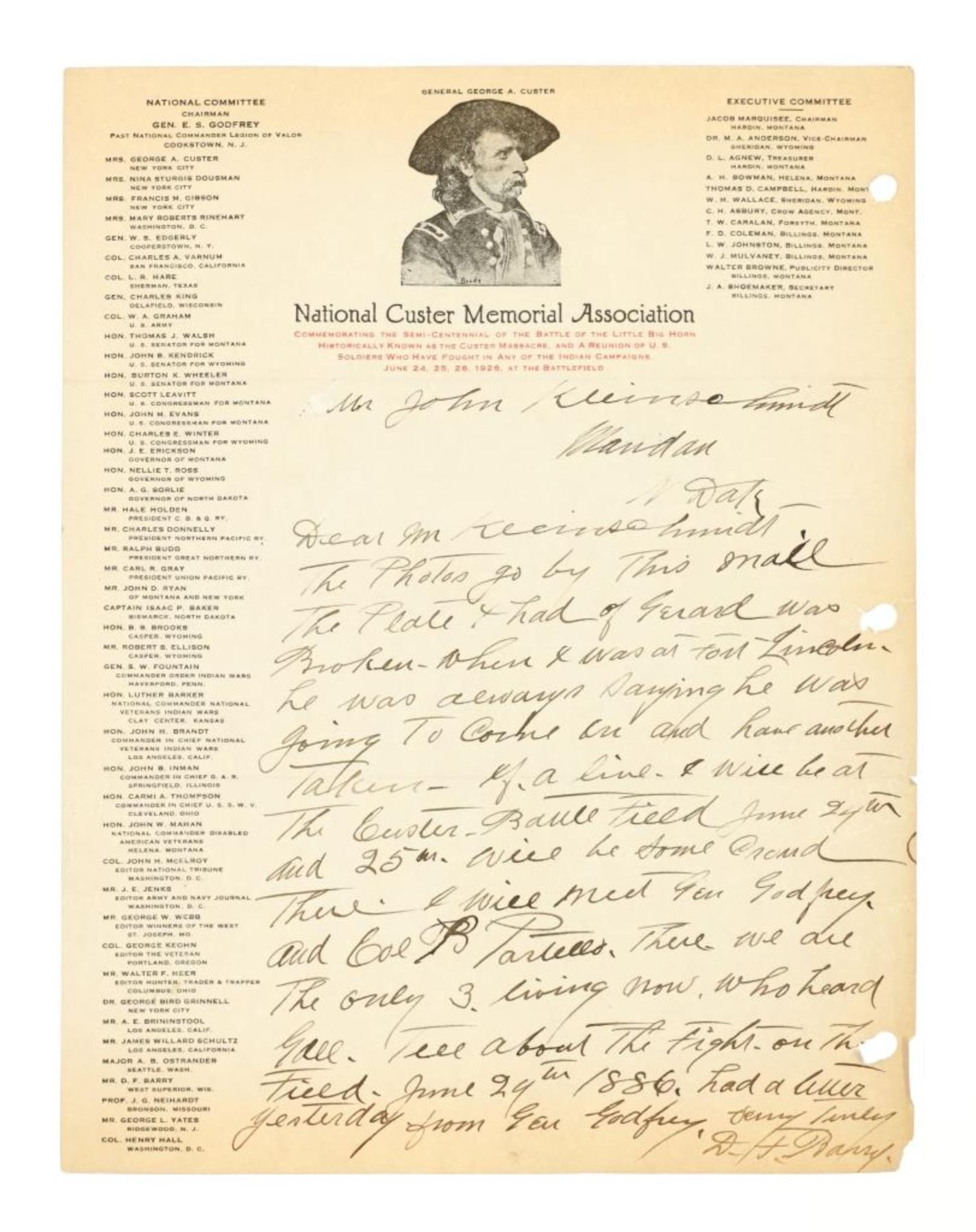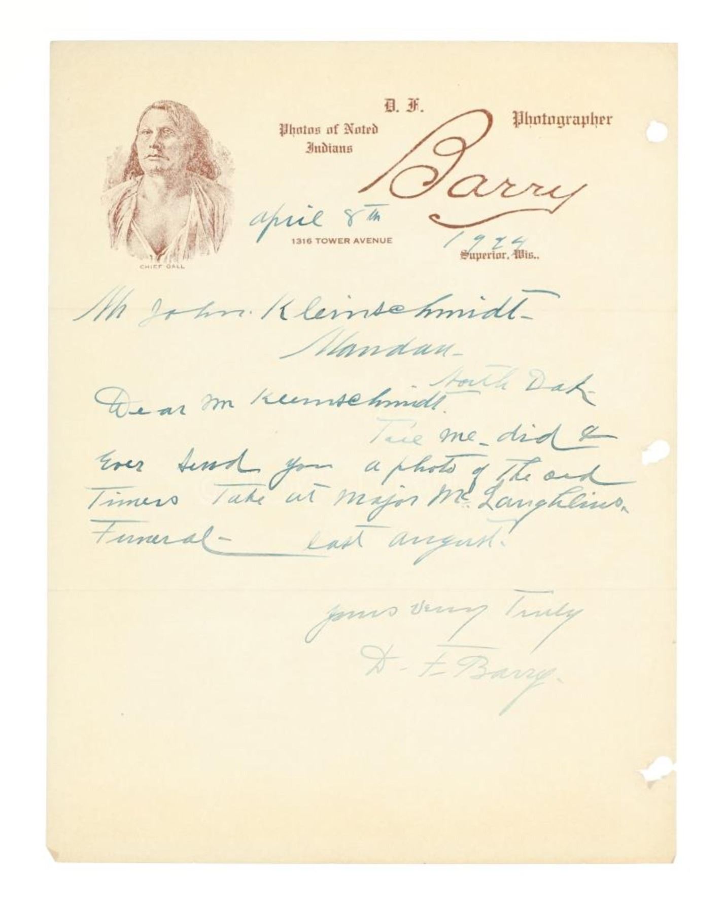 David Francis Barry (1854-1934) was one of the most noted photographers of the American Indian and U.S. Army participants in the Sioux War of 1876 and is attributed with some of the most recognizable surviving images from this period in the history of the American West. Barry first came to the west in the 1870’s to apprentice under photographer O.S. Goff, who worked as the photographer at Fort Abraham Lincoln. It was from this post the Lieutenant Colonel George Armstrong Custer led his Seventh U.S. Cavalry division in May 1876 to the battle of the Little Bighorn in southwestern Montana. This is considered one of the largest collection of Barry photographs from one historic Montana family offered for public sale.