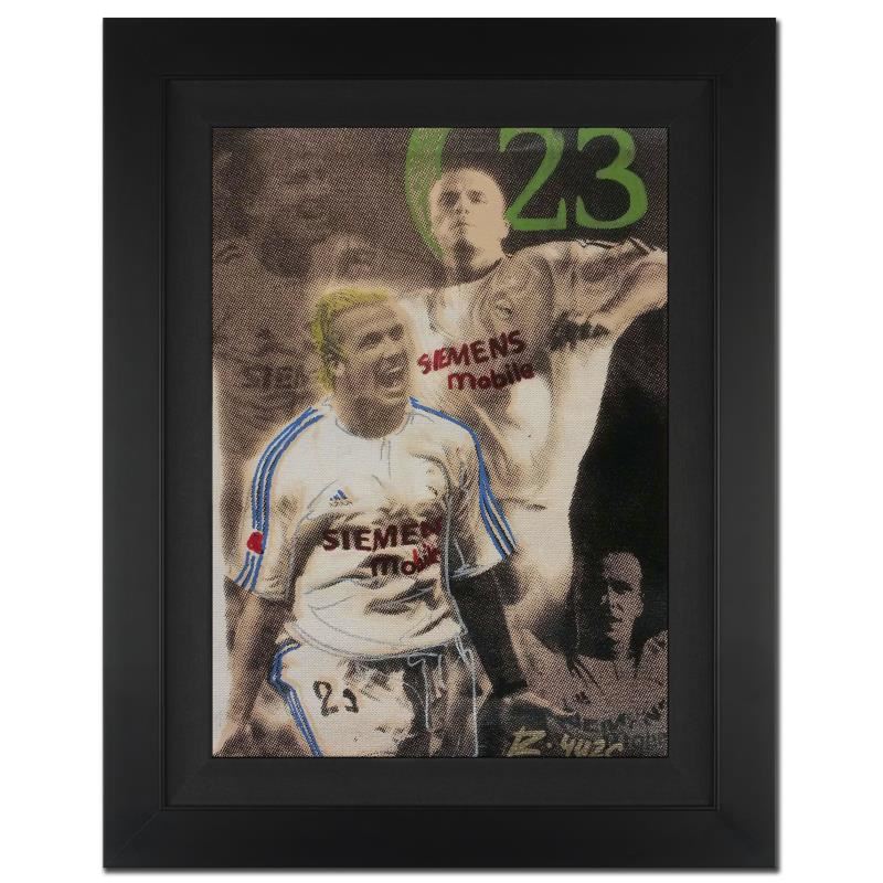 "David Beckham Pop Stamp" is a one-of-a-kind hand-pulled silkscreen and mixed media painting on canvas by Ringo (Daniel Funes) - protege of Andy Warhol's apprentice, Steve Kaufman! This piece is hand signed by the artist and Includes Certificate of Authenticity! Measures approx. 16" x 21" (with frame); 11" x 16" (image).